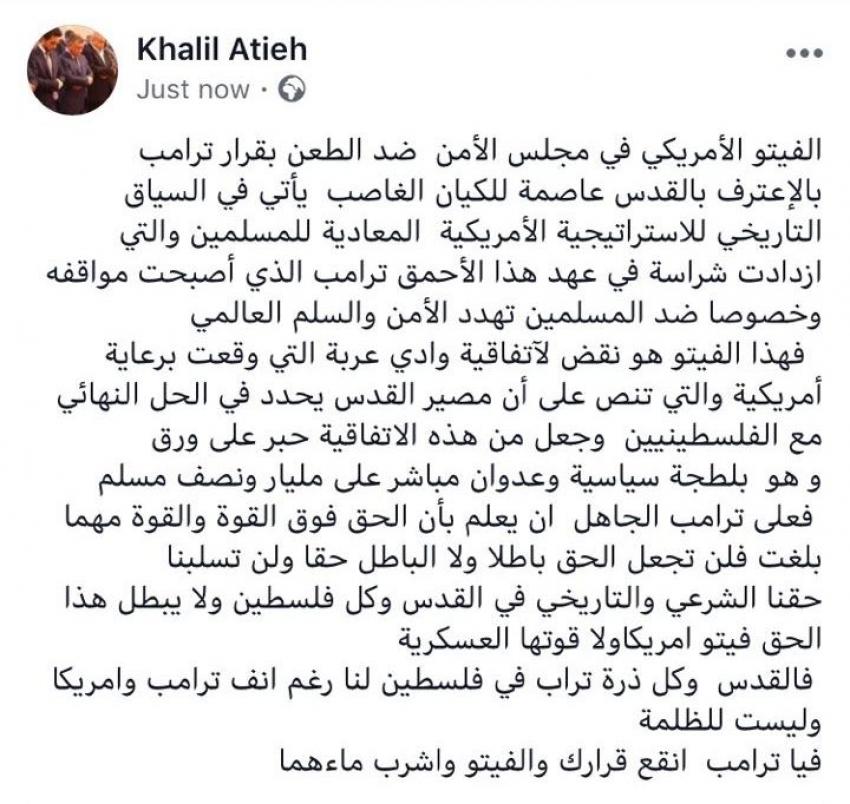 واضاف عطية، في منشور له عبر صفحته الشخصية في موقع التواصل الاجتماعي فيسبوك 'يا ترامب انقع قرارك والفيتو واشرب ماءهما'.