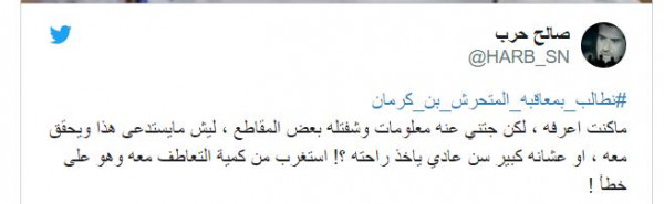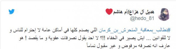 وأثار تصرف بن كرمان وابن قرية تابعة لمحافظة القنفذة في منطقة مكة المكرمة، غضبًا واسعًا بعد أن اعتبر كثيرون ما قام به المسن خروجًا غير مقبول عن التصرفات الطريفة التي اعتاد نشرها في لمتابعي حسابه بموقع "سناب شات" والذين يفوق عددهم 100 ألف متابع.