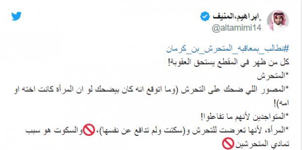 وبدأ الغضب والمطالب بمحاسبة بن كرمان الذي يبلغ من العمر 70 عامًا، كأكبر نجوم مواقع التواصل الاجتماعي سنًا في السعودية، بعد التداول اللافت لمقطع الفيديو الذي ظهر فيه وهو يمد يده نحو ممرضة في مستشفى مدينة القنفذة العام قبل أن تبتعد عنه.