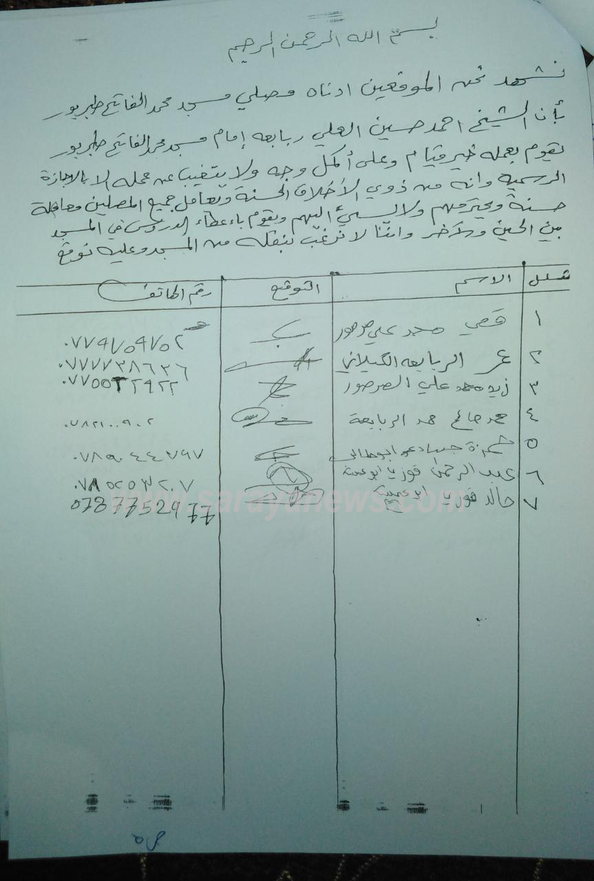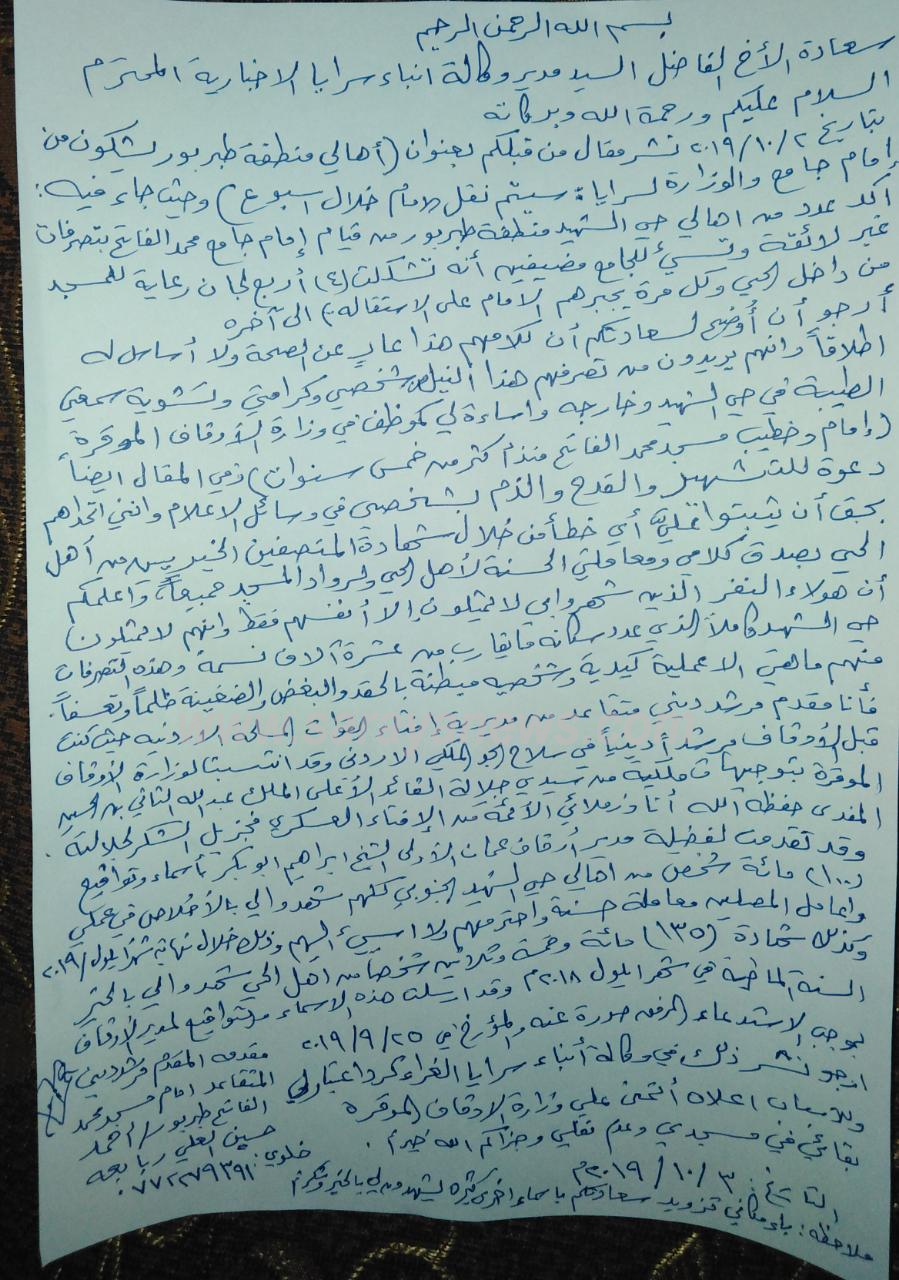 وبين الاهالي ان بعض المواطنين حاولوا فرض بعض الامور على امام المسجد الا إنه رفض تطبيقها بحكم عمله ما ادى الى لجوئهم لشكوى كيدية على مواقع التواصل الاجتماعي .