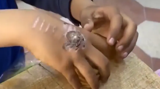 وظهر الطفل في الفيديو، وهو يجيب على أسئلة البقال الذي سأله عن سبب التشوه على ظاهر يديه، حيث ردَّ قائلا: " .. أضعت مبلغ 100 دينار كنت سأشتري بها علبة ألوان لكنه أحرق يدي بهذا الشكل"، وأضاف:" .. أحرق يدي بشوكة الأكل الساخنة"، وردا على سؤال حول والدته، قال:" .. هي الأخرى في المستشفى".