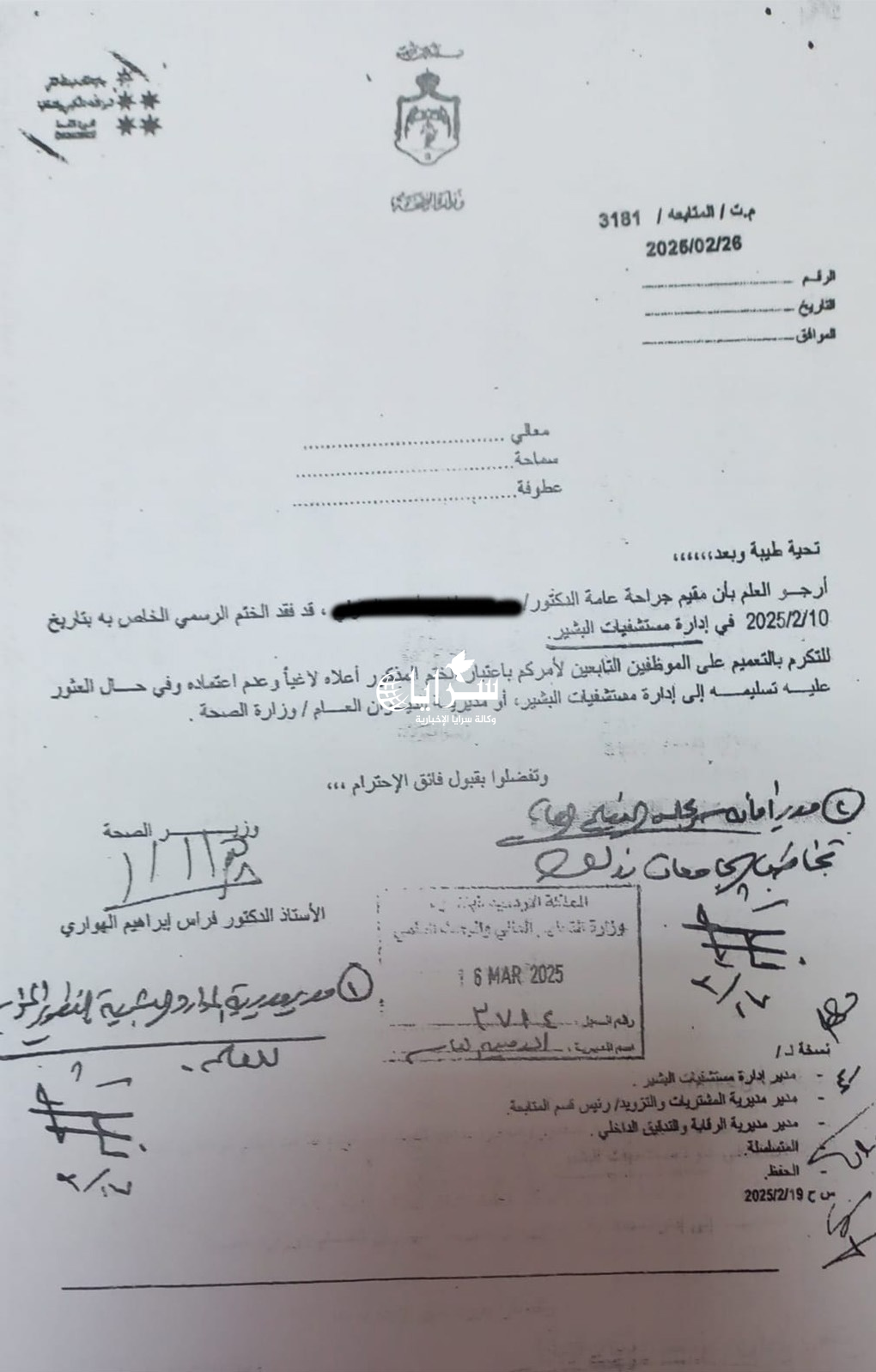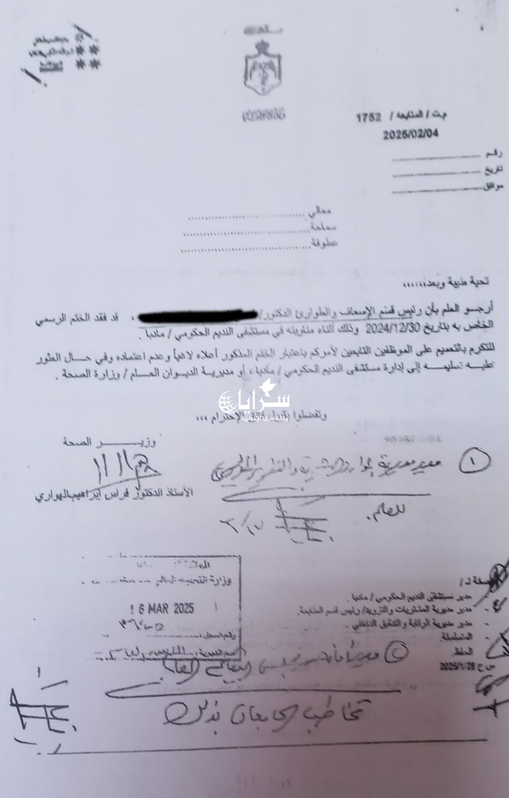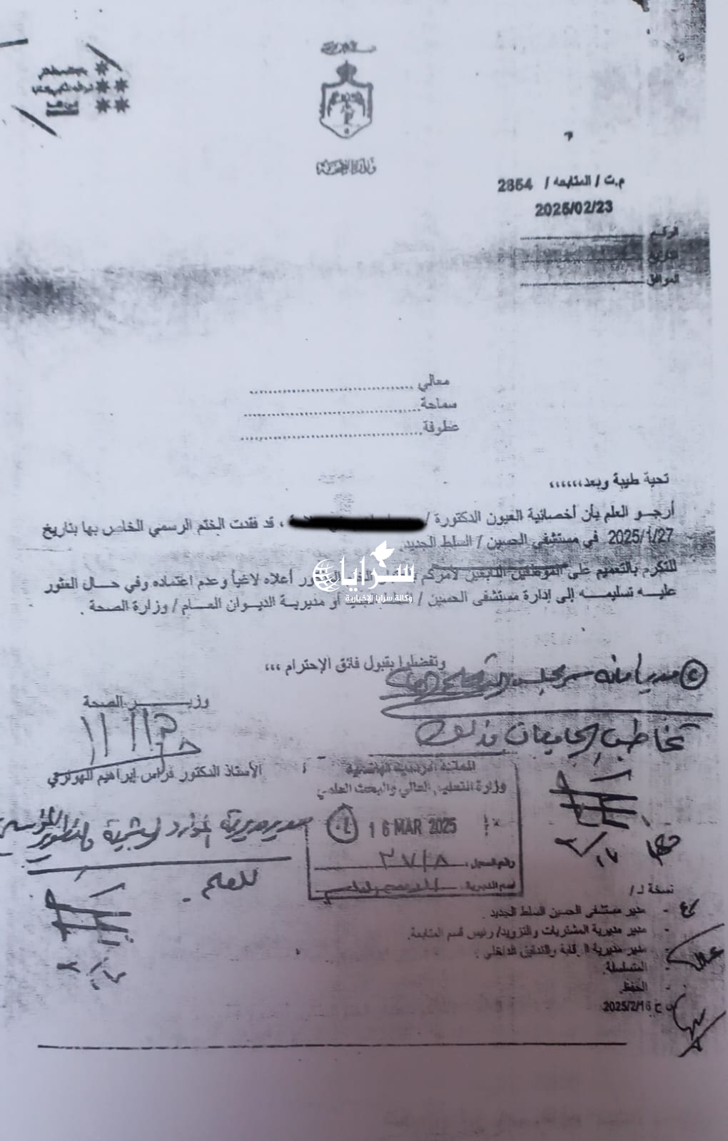 الصحة تعمم بفقدان أختام أطباء في مستشفياتها وعدم التعامل معها  ..  وثائق
