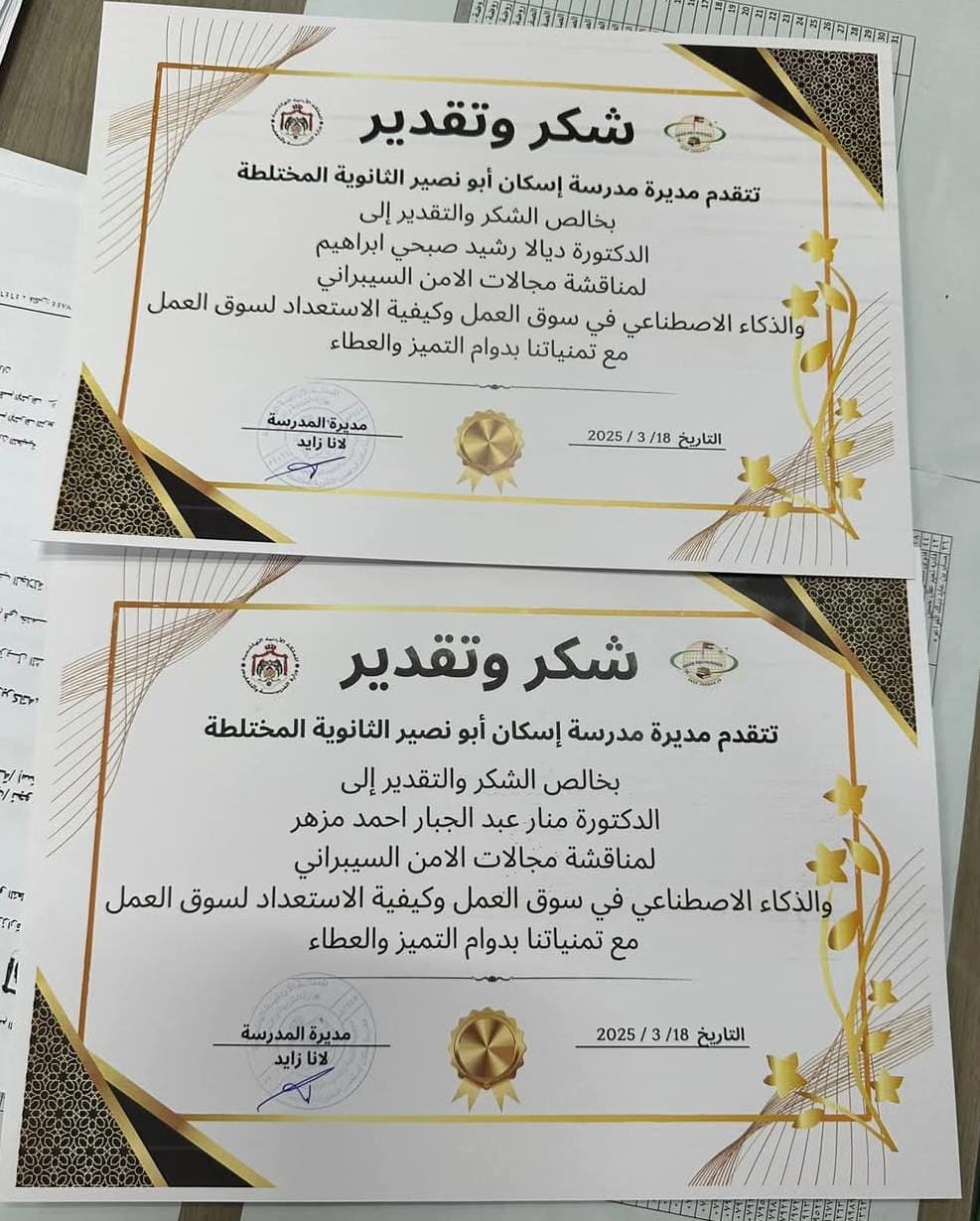 • محاضرة في الأمن السيبراني والذكاء الاصطناعي من "عمان العربية" لطالبات مدرسة إسكان أبو نصير الثانوية المختلطة