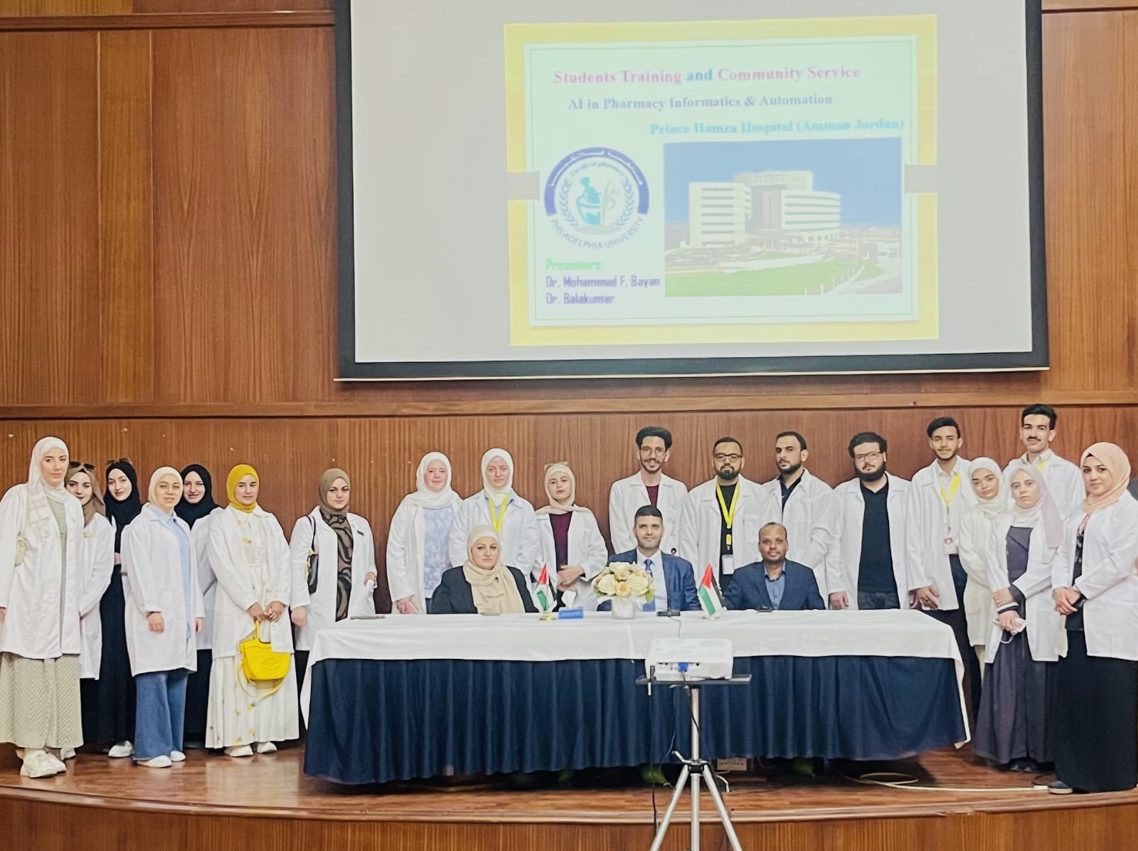 وخلال الزيارة، التقى الوفد مع مديرة الصيدليات في مستشفى الأمير حمزة الدكتورة سرى العتوم، التي اصطحبتهم في جولة تعريفية شاملة لأقسام الصيدليات المختلفة داخل المستشفى. تم خلالها مناقشة أساليب وطرق صرف الأدوية المتنوعة، بالإضافة إلى التطرق إلى كيفية إدارة المخزون الدوائي وتوزيع الأدوية بشكل دقيق وآمن. كما قدم كل من الدكتور محمد بيان والأستاذ الدكتور بالاكومار محاضرة توعوية في مسرح المستشفى بعنوان: "دور الذكاء الاصطناعي في الصيدلة وأتمتة المعلومات الدوائية"، حيث تم تسليط الضوء على أهمية الابتكارات التكنولوجية في تحسين جودة الرعاية الصحية وكفاءة العمليات الدوائية.