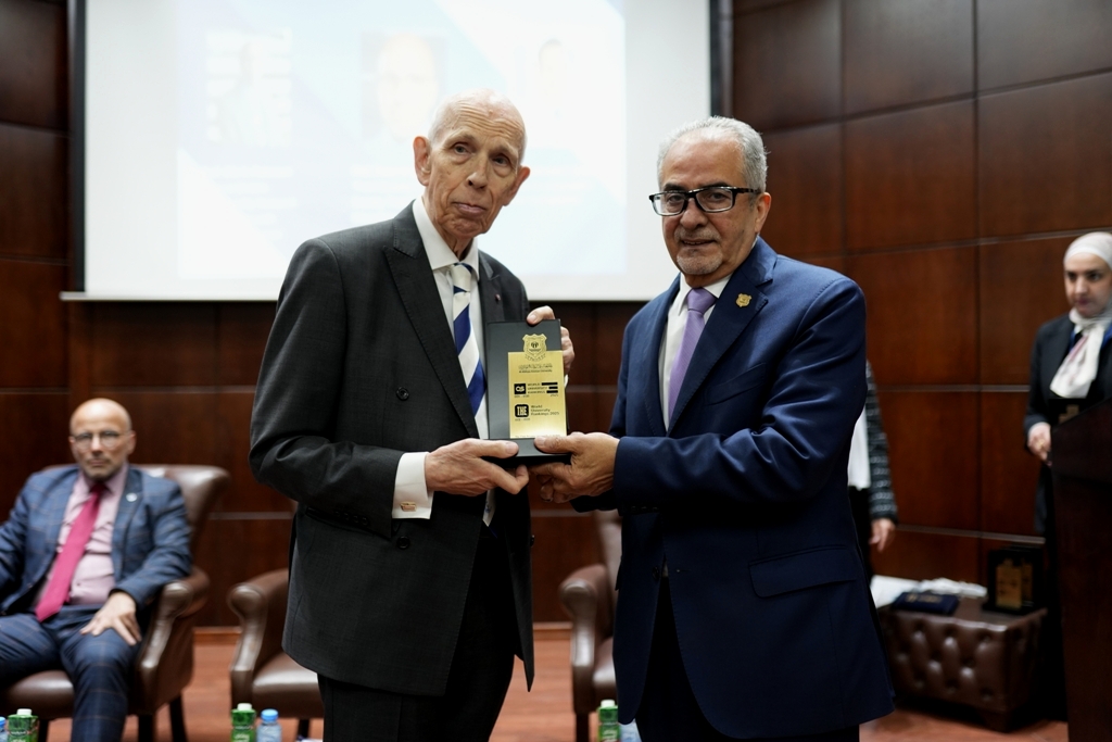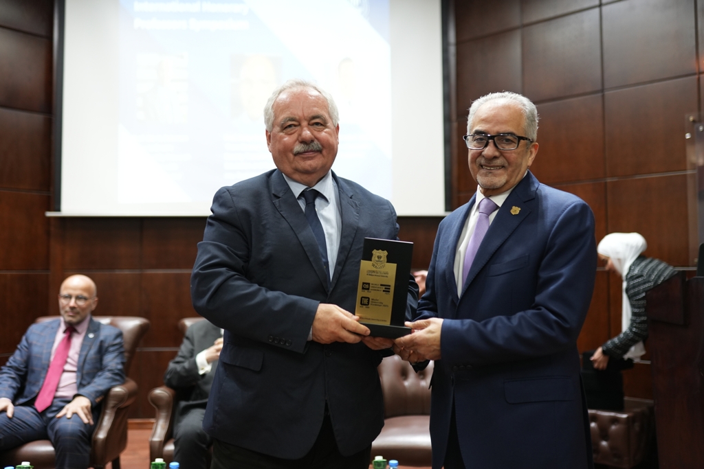 وفي نهاية الندوة قام الاستاذ الدكتور الرئيس ساري حمدان بتكريم العلماء الضيوف بالدرع التذكاري للجامعة .