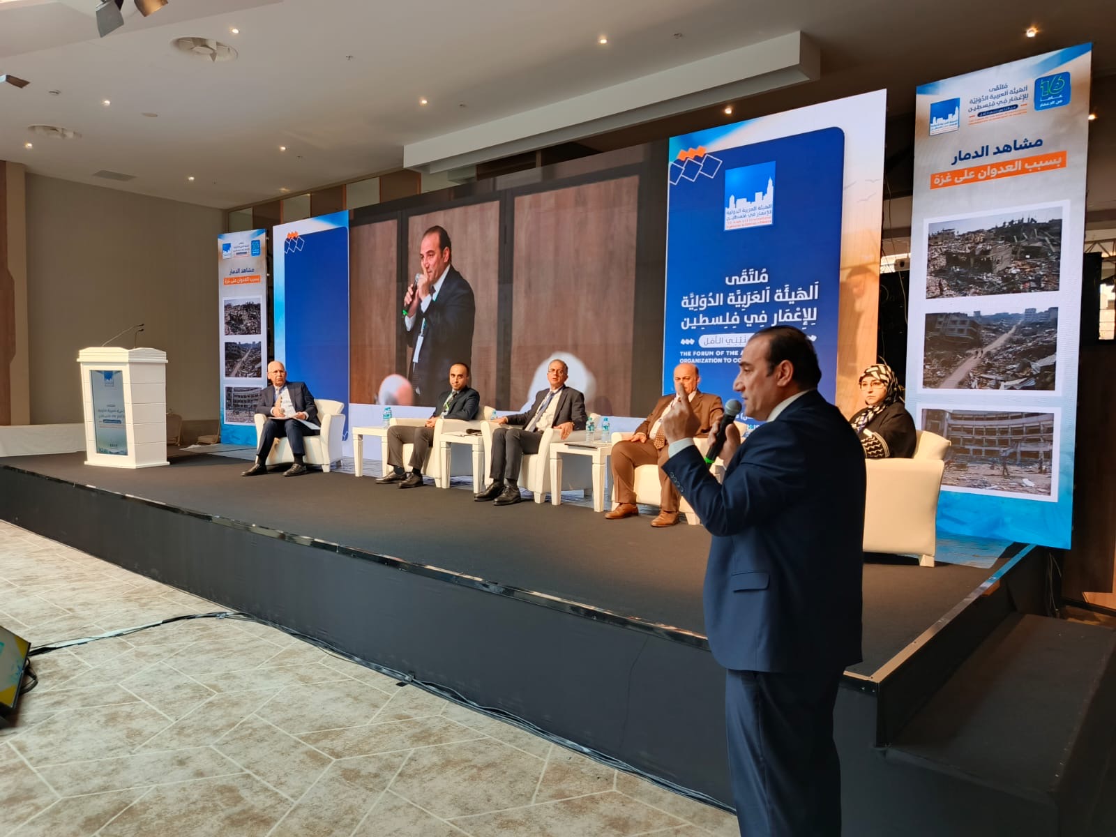 وتحدث في الملتقى م.اسامة العيسوي رئيس مكتب الهيئة في فلسطين، كما تم عرض رؤية الهيئة الاستراتيجية لإعادة الإعمار من خلال مكتب الهيئة في غزة، وعرض فيديو حول الدمار في القطاع واحتياجاته ومشاريع الهيئة، والاعلان عن منصة مشاريع الاعمار.