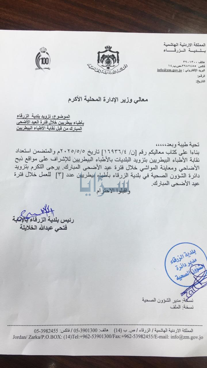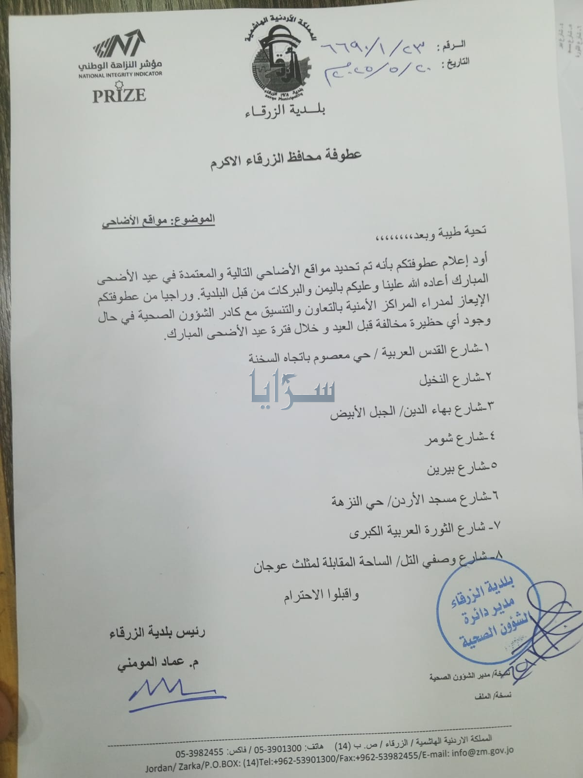وأكد رئيس بلدية الزرقاء المهندس عماد المومني؛ أن البلدية تولي أهمية خاصة للمحافظة على النظافة العامة خلال موسم الأضاحي، مشيراً إلى أن كوادر البلدية ستواصل متابعة جميع المواقع المخصصة لضمان التزام الباعة بالتعليمات والاشتراطات الصحية، من الذين حصلوا على تصريحات رسمية من خلال البلدية، بما يعكس الصورة الحضارية للمدينة.