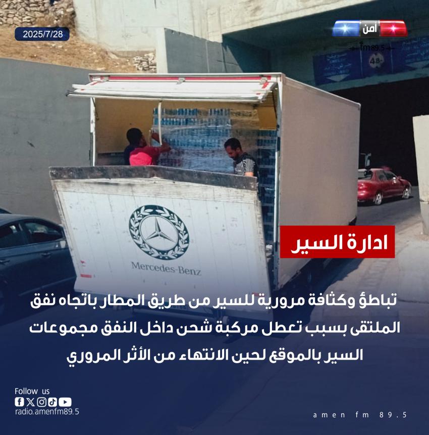 وقالت إدارة السير في مديرية الأمن العام، إن طريق المطار باتجاه نفق الملتقى يشهد تباطؤ وكثافة مرورية للسير بسبب تعطل مركبة شحن داخل النفق.