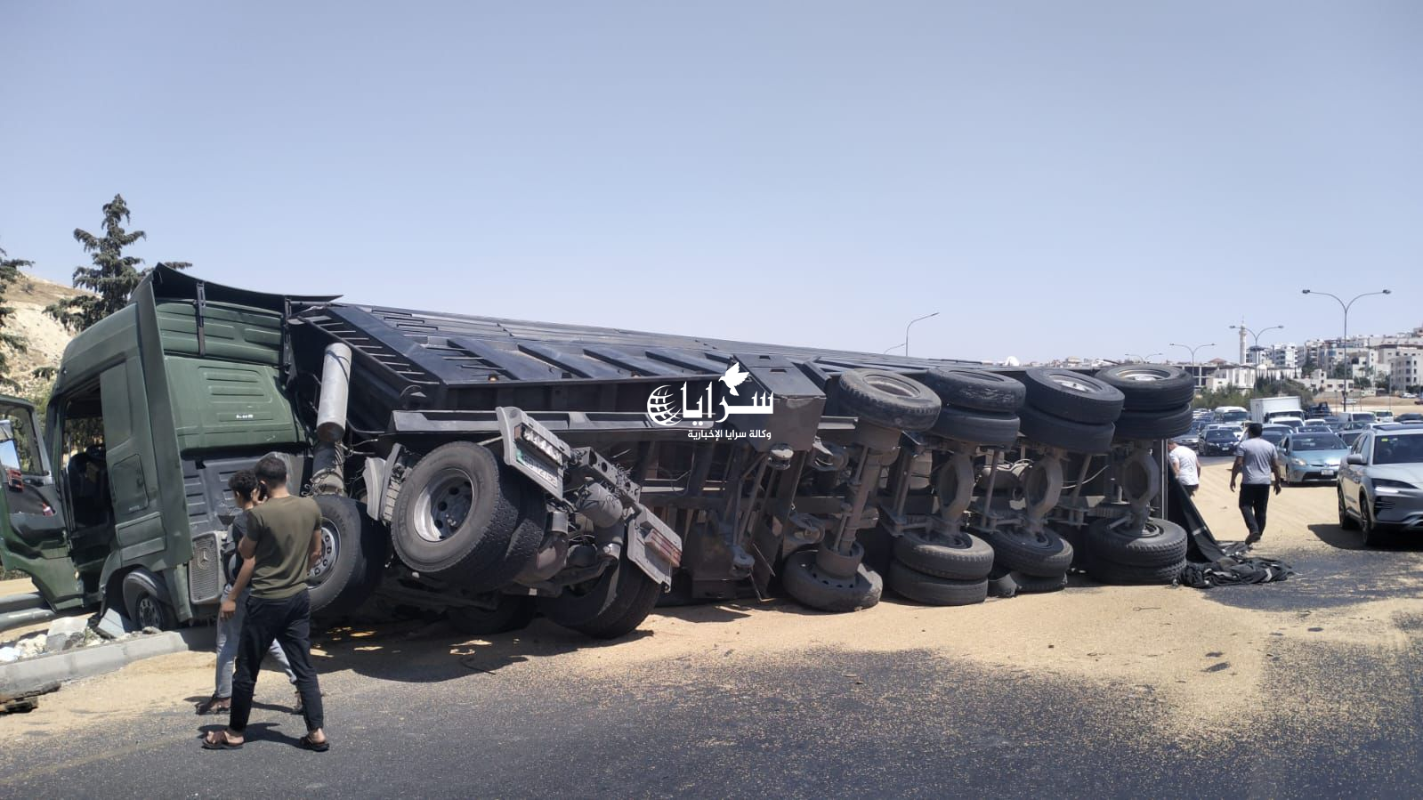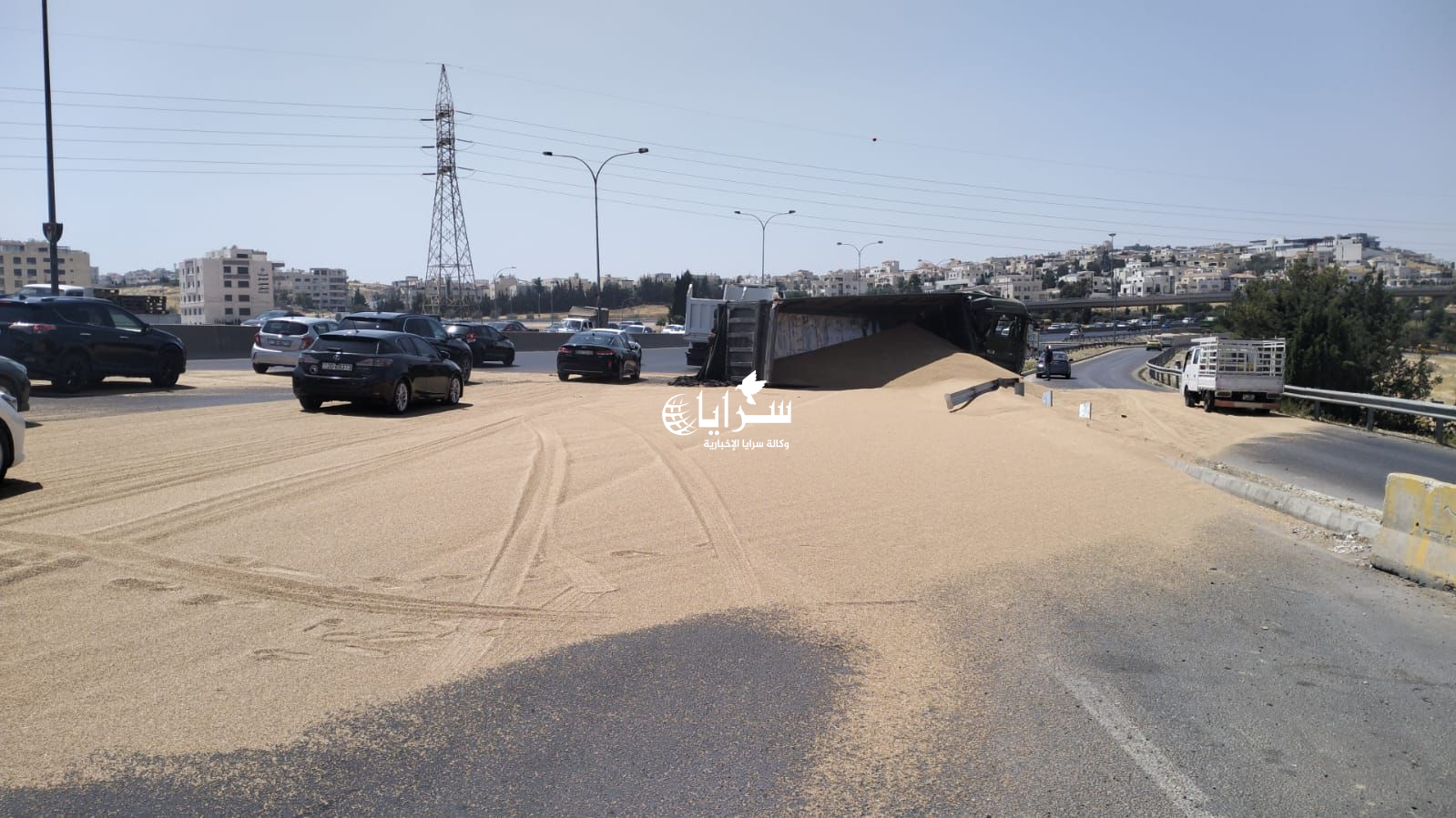 سرايا - يشهد طريق المطار في هذه الأثناء ازدحاماً مرورياً خانقاً، إثر حادث انقلاب مركبة شحن (قلاب) محمّلة بالرمل، وذلك بعد جسر مرج الحمام باتجاه جسر الأمير حسين.
