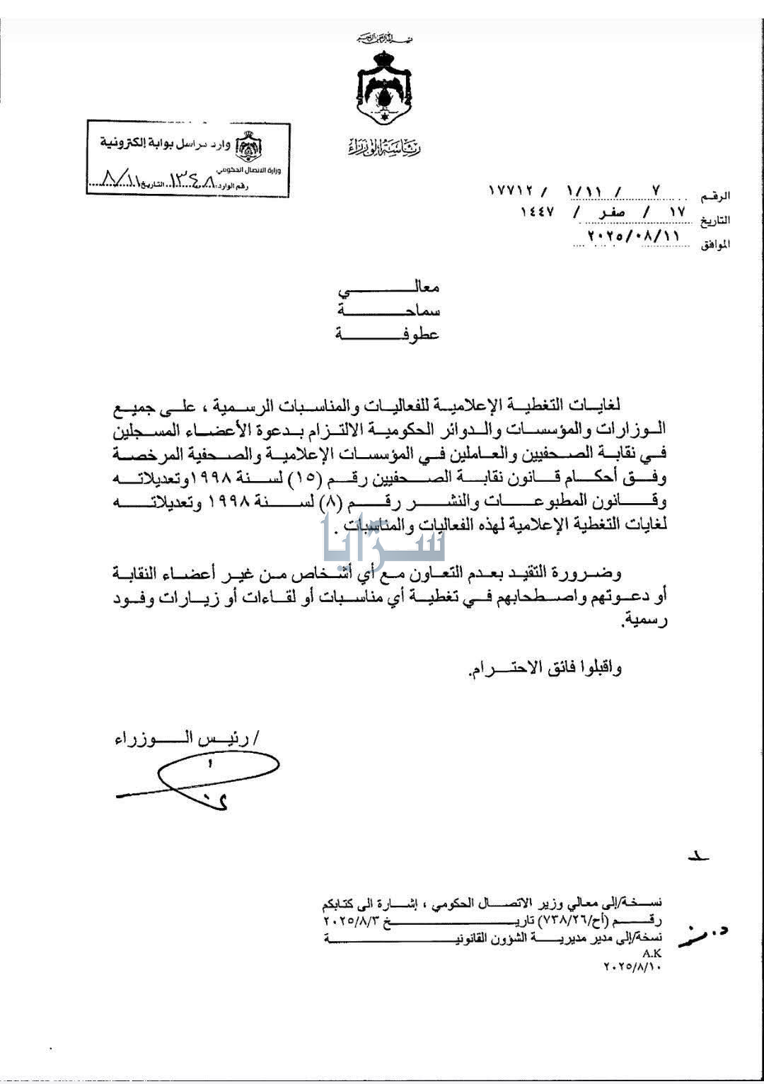 سرايا - خاص - أوعز رئيس الوزراء الدكتور جعفر حسان لجميع الوزارات والمؤسسات والدوائر الحكوميه بالالتزام بدعوة الأعضاء المسجلين في نقابة الصحفيين والعاملين في المؤسسات الاعلامية والصحفية المرخصة وذلك لغايات التغطية الاعلامية للفعاليات والمناسبات الرسمية.