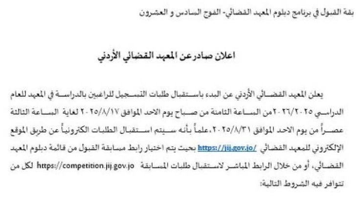 سرايا - يعلن المعهد القضائي الأردني عن البدء باستقبال طلبات التسجيل للراغبين بالدراسة في المعهد للعام الدراسي 2025/2026 من الساعة الثامنة من صباح يوم الاحد الموافق 17/8/2025 لغاية الساعة الثالثة عصراً من يوم الاحد الموافق 31/8/2025،علماً بأنه سيتم استقبال الطلبات الكترونياً عن طريق الموقع الإلكتروني للمعهد القضائي https://jij.gov.jo/ بحيث يتم اختيار رابط مسابقة القبول من قائمة دبلوم المعهد القضائي، أو من خلال الرابط المباشر لاستقبال طلبات المسابقة https://competition.jij.gov.jo لكل من تتوافر فيه الشروط التالية: