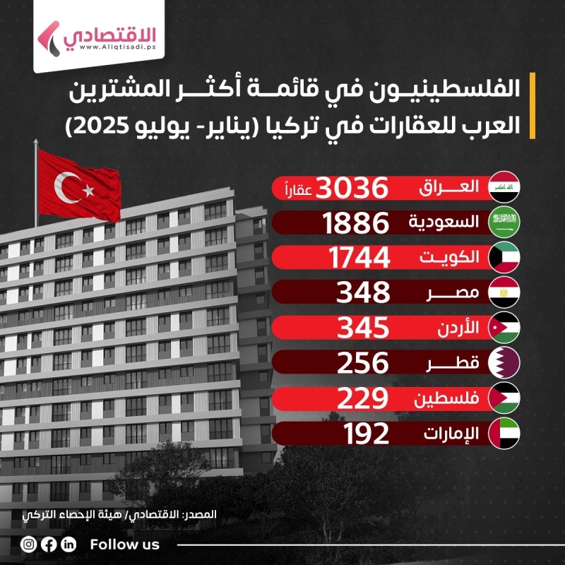 سرايا - أظهر مسح أجراه "الاقتصادي" لبيانات رسمية صادرة عن هيئة الإحصاء التركية أن الأردنيين حلّوا في المرتبة الخامسة بين أكثر الجنسيات العربية شراء للعقارات في تركيا خلال الفترة (يناير – يوليو 2025)، وذلك بعد العراقيين والسعوديين والكويتيين والمصريين.