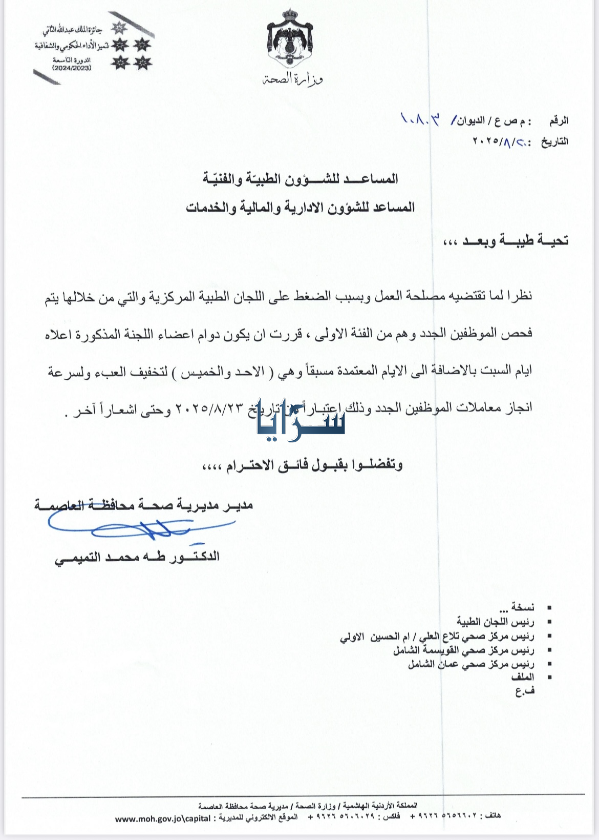 سرايا - حصلت سرايا على كتاب رسمي صادر عن مديرية صحة محافظة العاصمة، جاء فيه أن دوام أعضاء اللجان الطبية، المكلفين بفحص الموظفين الجدد من الفئة الأولى، سيستمر أيام السبت بالإضافة إلى الأيام المعتمدة مسبقاً (الأحد والخميس).