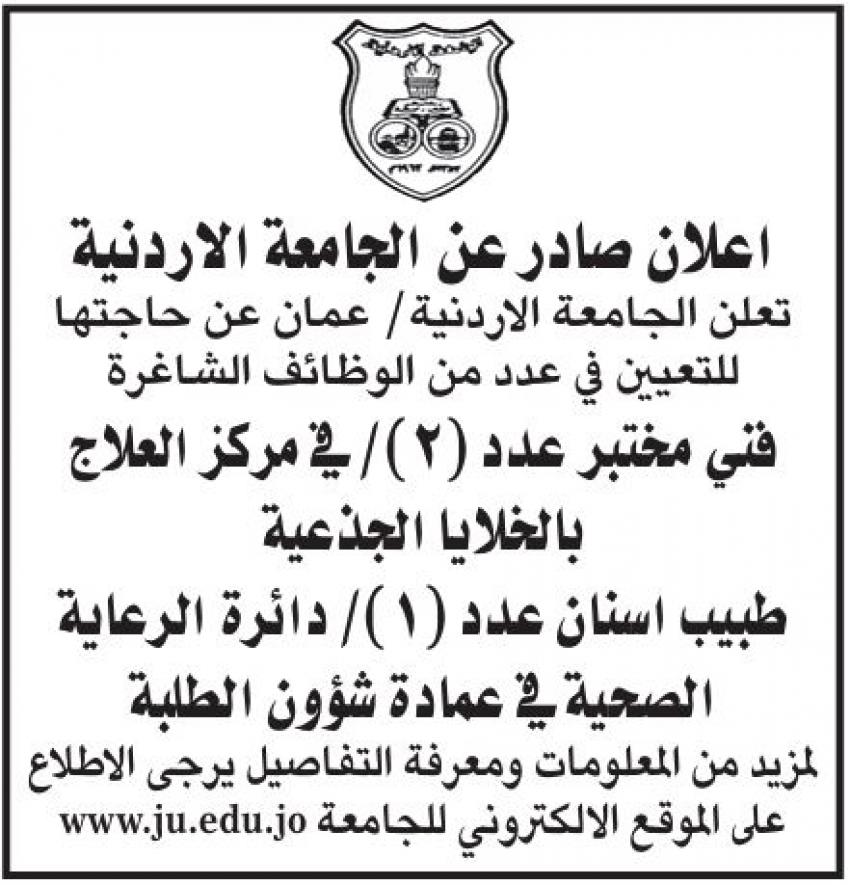 سرايا - أعلنت الجامعة الأردنية - عمان عن حاجتها لتعيين فني مختبر (عدد 2) في مركز العلاج بالخلايا الجذعية، وطبيب أسنان (عدد 1) في دائرة الرعاية الصحية بـعمادة شؤون الطلبة.