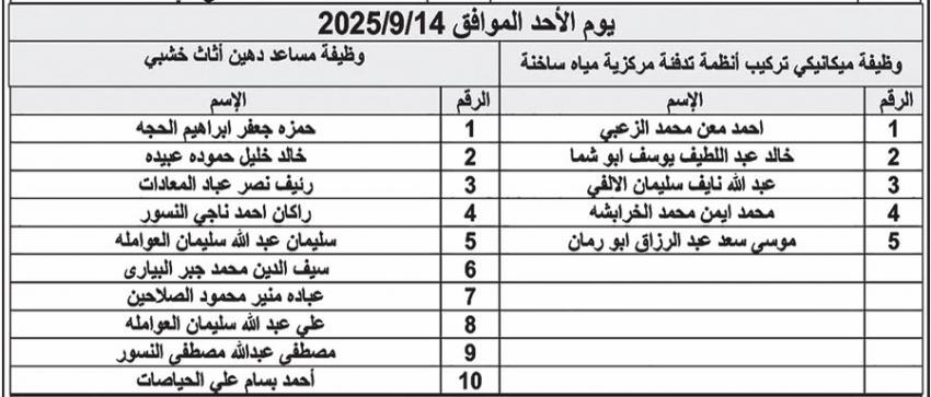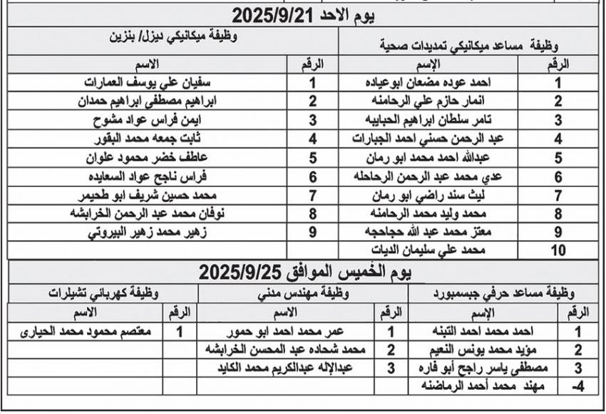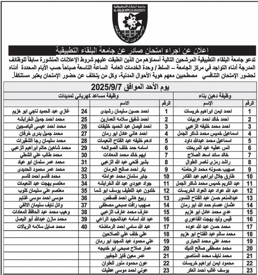 وفي سياق متصل، دعت جامعة البلقاء التطبيقية المرشحين المدرجة أسماؤهم التواجد في مركز الجامعة - السلط / وحدة الخدمات العامة الساعة التاسعة صباحاً حسب الأيام المحددة لـحضور الامتحان التنافسي مصطحبين معهم هوية الأحوال المدنية، وكل من يتخلف عن حضور الامتحان يعتبر مستنكفاً.