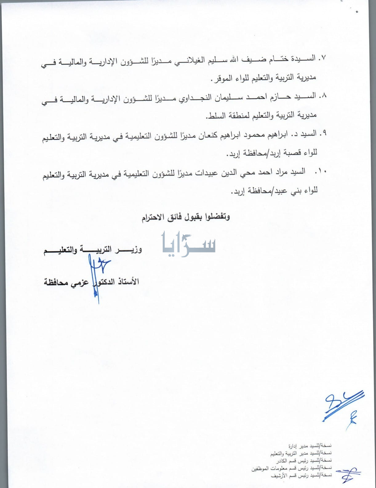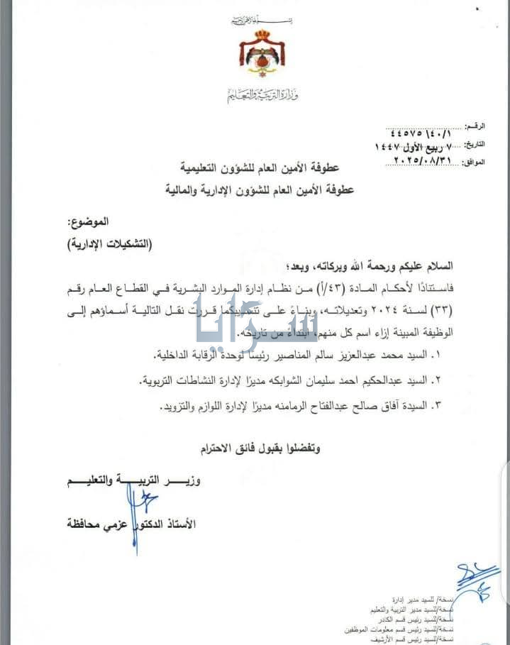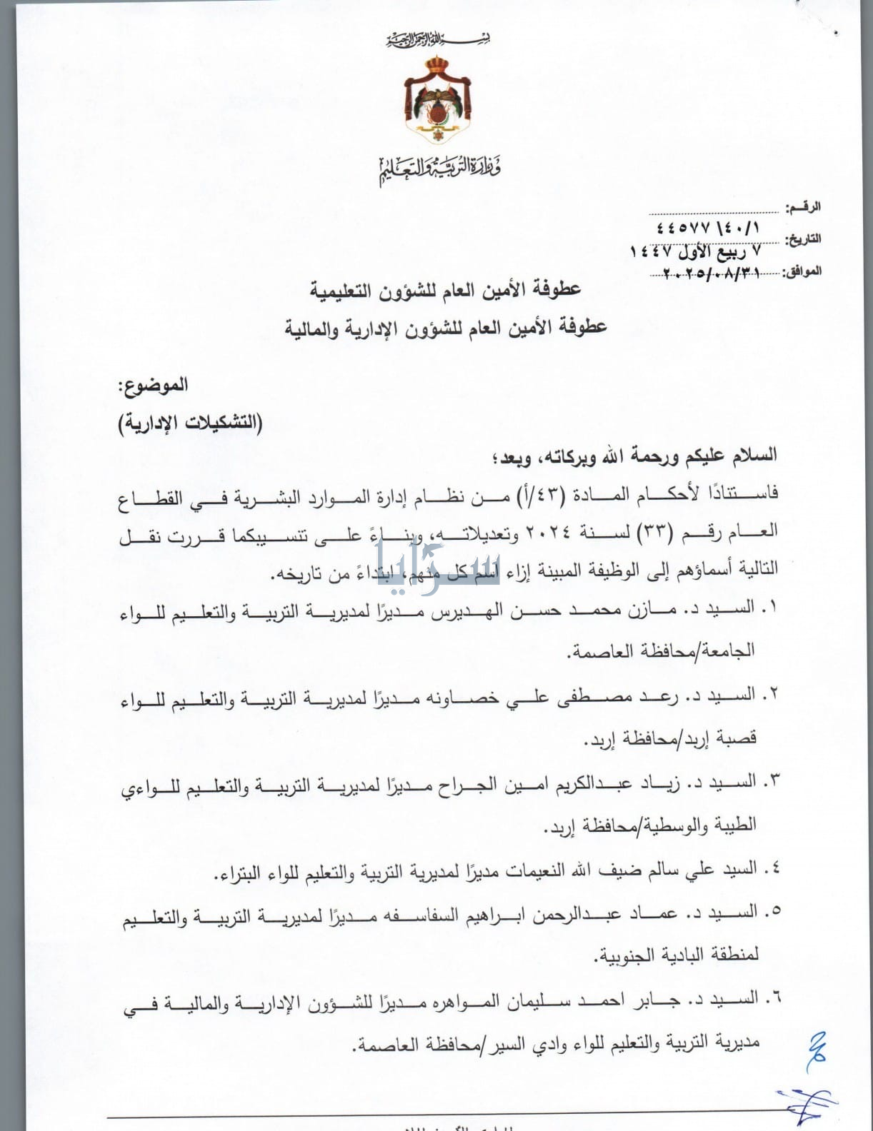 إضافة إلى مدراء للشؤون الإدارية والمالية، إلى جانب مدراء إدارات مركزية في الوزارة، وذلك في إطار خطط الوزارة لتجديد الدماء وتعزيز كفاءة العمل الإداري والتربوي.