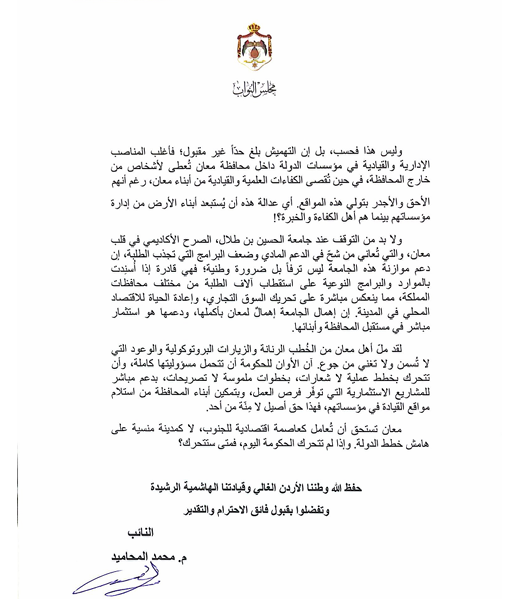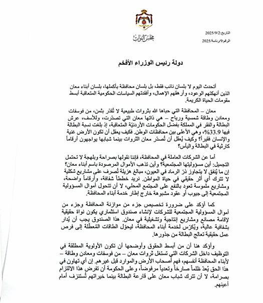 وختم المحاميد بالقول: "لقد ملّ أهل معان من الخطب الرنانة والزيارات البروتوكولية والوعود التي لا تسمن ولا تغني. آن الأوان أن تتحمل الحكومة مسؤوليتها بخطط عملية لا شعارات. معان تستحق أن تعامل كعاصمة اقتصادية للجنوب، لا كمدينة منسية على الهامش".