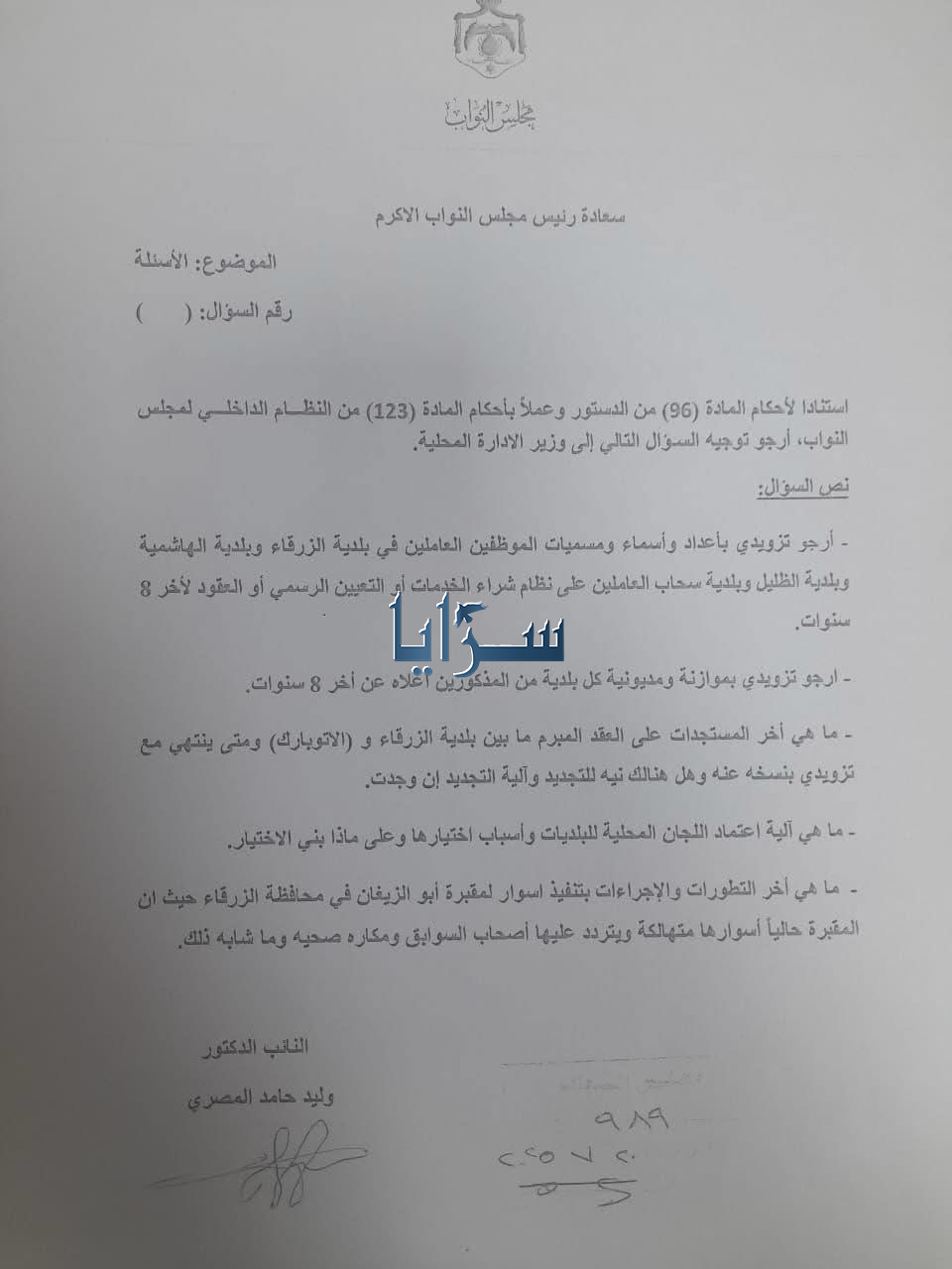 سرايا - قدّم النائب الدكتور وليد المصري سؤالاً نيابياً موجهاً إلى وزير الإدارة المحلية، استناداً للمادة (96) من الدستور والمادة (123) من النظام الداخلي لمجلس النواب، طالب فيه بكشف معلومات تفصيلية تخص أربع بلديات هي: الزرقاء، الهاشمية، الضليل، وسحاب.
