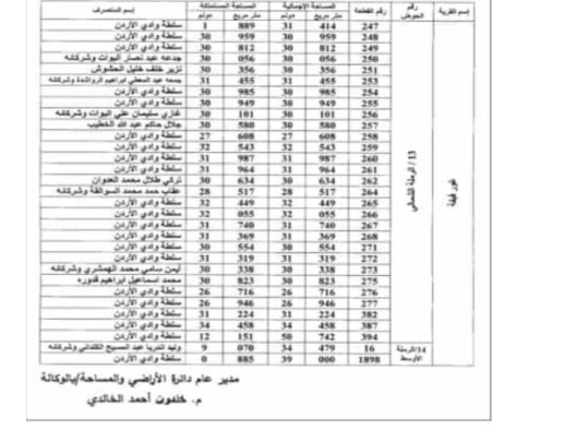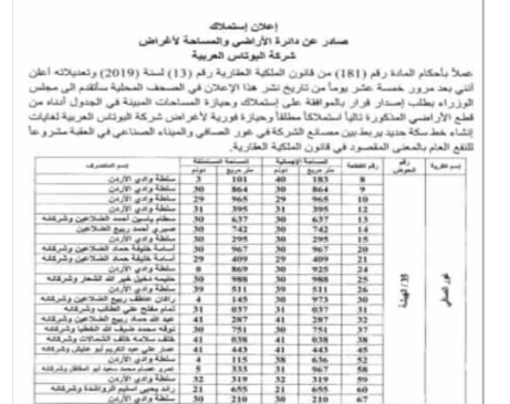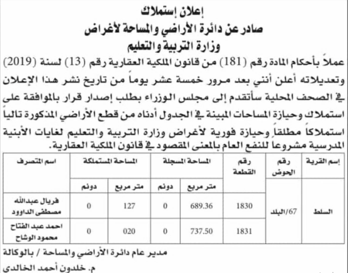 وقالت دائرة الأراضي والمساحة إنها ستتقدم بعد 15 يوما من تاريخه، إلى مجلس الوزراء بطلب إصدار قرار بالموافقة على استملاك مساحات من قطع أراضٍ، استملاكا مطلقا وحيازة فورية لأغراض وزارة التربية والتعليم وشركة الكهرباء الوطنية وشركة البوتاس .ويأتي ذلك، عملا بأحكام المادة رقم (181) من قانون الملكية العقارية رقم (13) لسنة 2019.