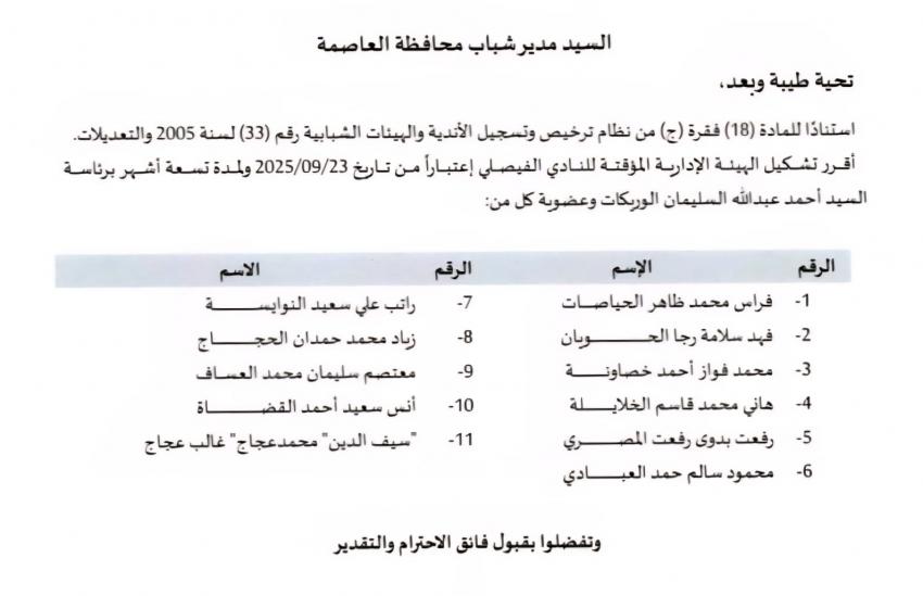 سرايا - أعلنت وزارة الشباب عن تشكيل لجنة مؤقتة للنادي الفيصلي، اعتبارا من اليوم الثلاثاء ولمدة 9 أشهر.