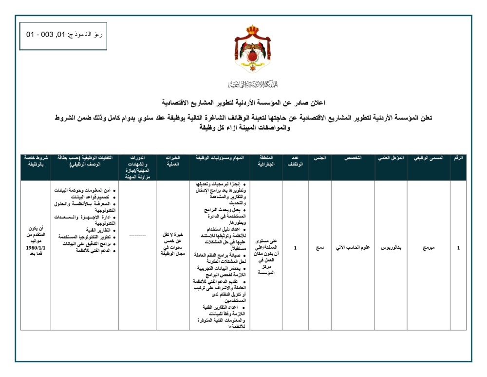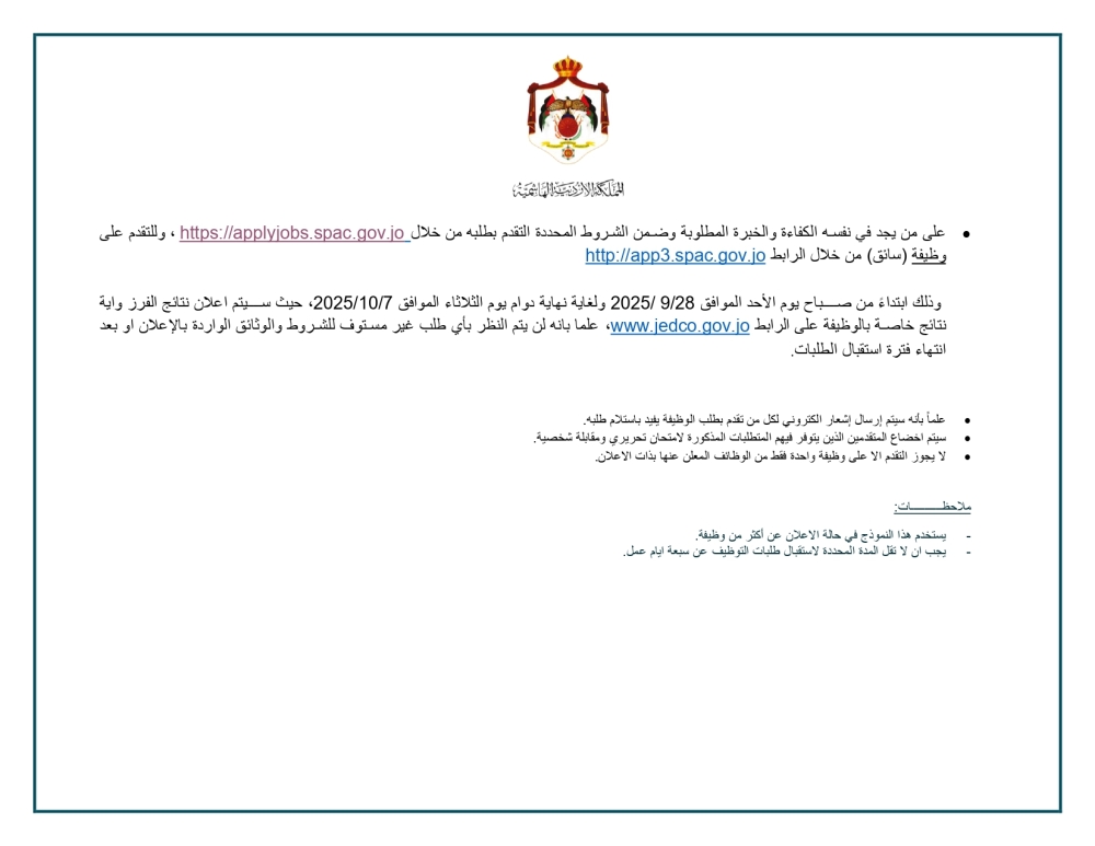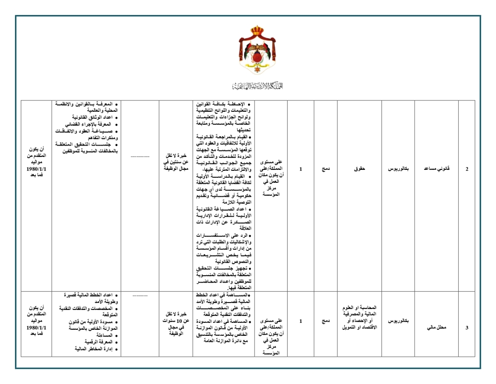 سرايا - أعلنت المؤسسة الأردنية لتطوير المشاريع الاقتصادية عن فتح باب التقديم لعدد من الوظائف الشاغرة لحملة درجة البكالوريوس، من مواليد عام 1980 فما فوق، من كلا الجنسين، وفي جميع محافظات المملكة. التخصصات المطلوبة: بكالوريوس علم الحاسوب. بكالوريوس حقوق. بكالوريوس المحاسبة أو الاقتصاد أو العلوم المالية أو التمويل. بكالوريوس صحافة وإعلام. بكالوريوس الهندسة (الصناعية، الكهربائية، المدنية، أو البيئة). ودعت المؤسسة الراغبين بالتقديم إلى تجهيز الوثائق اللازمة وتعبئة الطلبات ضمن المواعيد المحددة، مؤكدة أن التعيين سيكون وفق أسس الكفاءة والتنافسية.