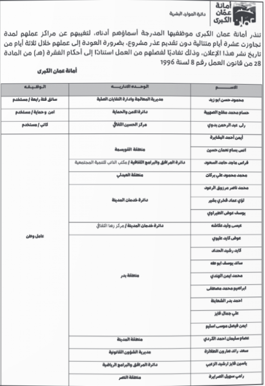 سرايا - أنذرت أمانة عمان الكبرى موظفيها المدرجة أسماؤهم أدناه، لتغيبهم عن مراكز عملهم لمدة تجاوزت عشرة أيام متتالية دون تقديم عذر مشروع، بضرورة العودة إلى عملهم خلال ثلاثة أيام من تاريخ الإعلان تفاديا لفصلهم.