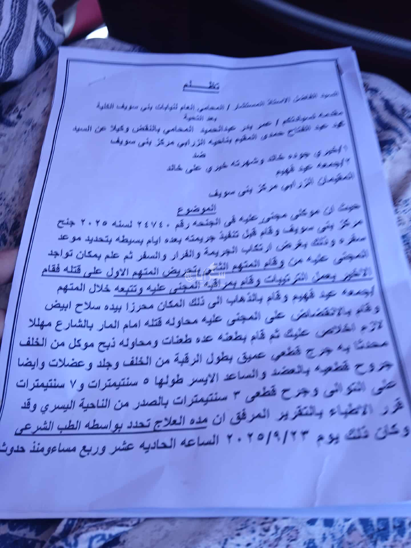 يذكر ان سرايا حصلت على نص الشكوى المقدّمة عن طريق المحامي عمر عبد العظيم عبد المقصود،والتي تنص على إن الحادثة وقعت مساء يوم الثلاثاء 23 أيلول/سبتمبر 2025، عندما نشب شجار بين نجل المشتكي والمتهم أمام أحد المحال التجارية بقرية تزمنت الشرقية – مركز بني سويف، حيث أقدم المتهم على إخراج سلاح أبيض (مطواة) وطعن المجني عليه عدة طعنات متفرقة في أنحاء جسده.