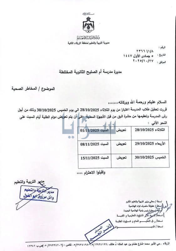 كما قرر أبو الفول تعويض الطلبة بالدوام أيام السبت خلال الأسابيع الثلاثة المقبلة (1/11، 8/11، و15/11/2025).