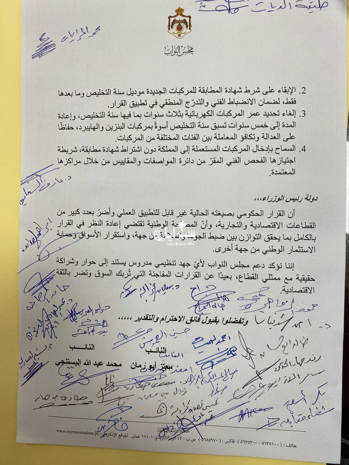 ووقّع على المذكرة عدد كبير من النواب دعمًا لمطالب أبو رمان والبستنجي في حماية القطاع وتنظيم السوق بما يراعي المصلحة الوطنية.