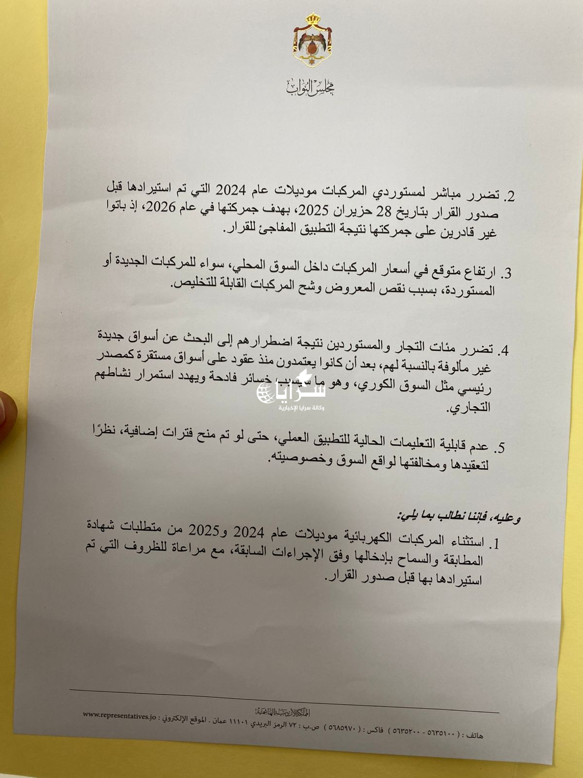 و استند النواب في مذكرتهم إلى مسؤوليتهم الرقابية والتشريعية، مؤكدين حرصهم على دعم قطاع تجارة المركبات الذي يوظف آلاف الأردنيين ويسهم في رفد خزينة الدولة.