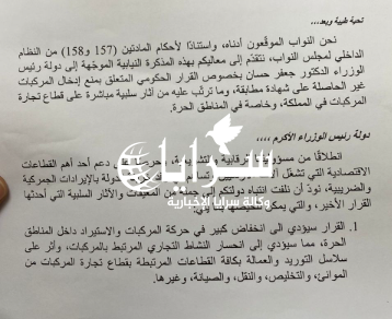 سرايا - وجّه النائبان معتز أبو رمان ومحمد البستنجي مذكرة نيابية إلى رئيس الوزراء، طالبا فيها بإعادة النظر في القرار الحكومي القاضي بمنع إدخال المركبات غير الحاصلة على "شهادة مطابقة"، لما ترتب عليه من آثار سلبية مباشرة على قطاع تجارة المركبات في المملكة، خاصة في المناطق الحرة.