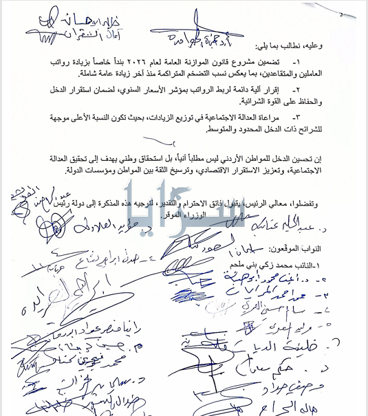 واختتمت المذكرة بالتأكيد على أن تحسين دخل المواطن الأردني "ليس مطلباً آنياً، بل استحقاق وطني يهدف إلى تحقيق العدالة الاجتماعية، وتعزيز الاستقرار الاقتصادي، وترسيخ الثقة بين المواطن ومؤسسات الدولة"