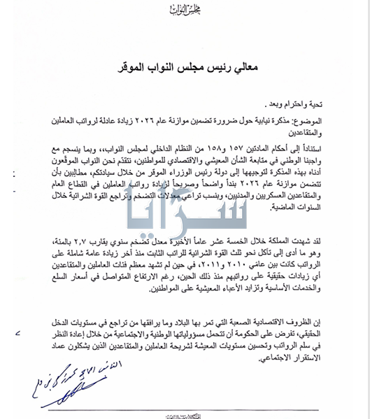 سرايا - طالب عدد من أعضاء مجلس النواب الحكومة بضرورة تضمين مشروع قانون الموازنة العامة لعام 2026 بنداً واضحاً وصريحاً لزيادة رواتب العاملين في القطاع العام والمتقاعدين العسكريين والمدنيين.