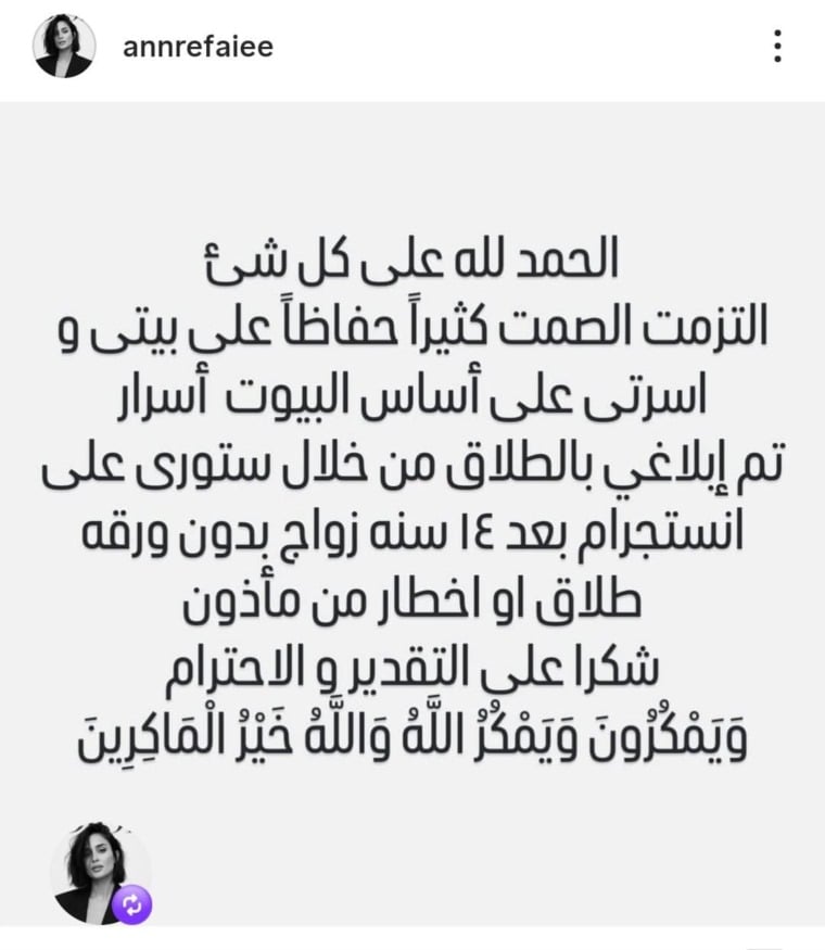 وقالت آن في منشور عبر حسابها الشخصي: "الحمد لله على كل شيء.. التزمت الصمت كثيراً حفاظاً على بيتي وأسرتي، على أساس أن البيوت أسرار، وتم توثيق طلاقي عبر ستوري على إنستغرام بعد 14 سنة زواج، دون ورقة طلاق أو إخطار من مأذون".