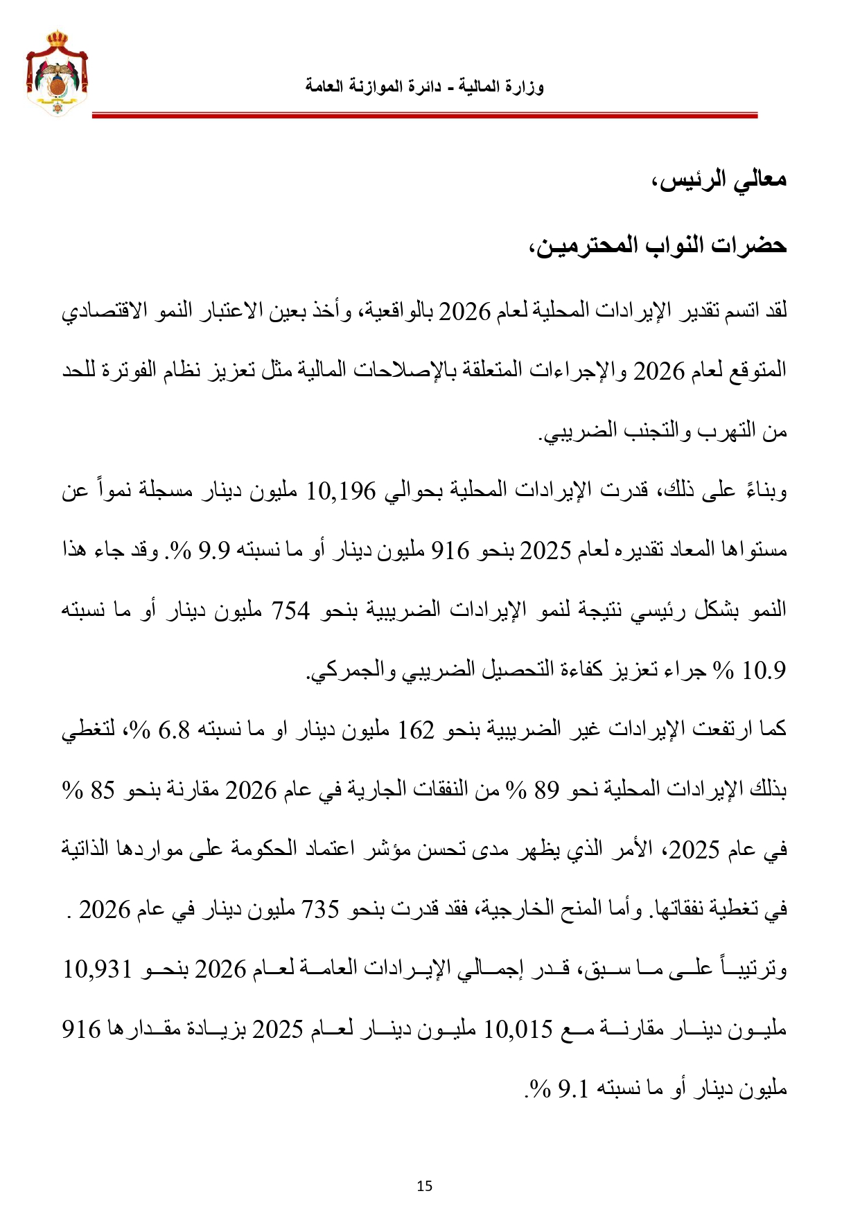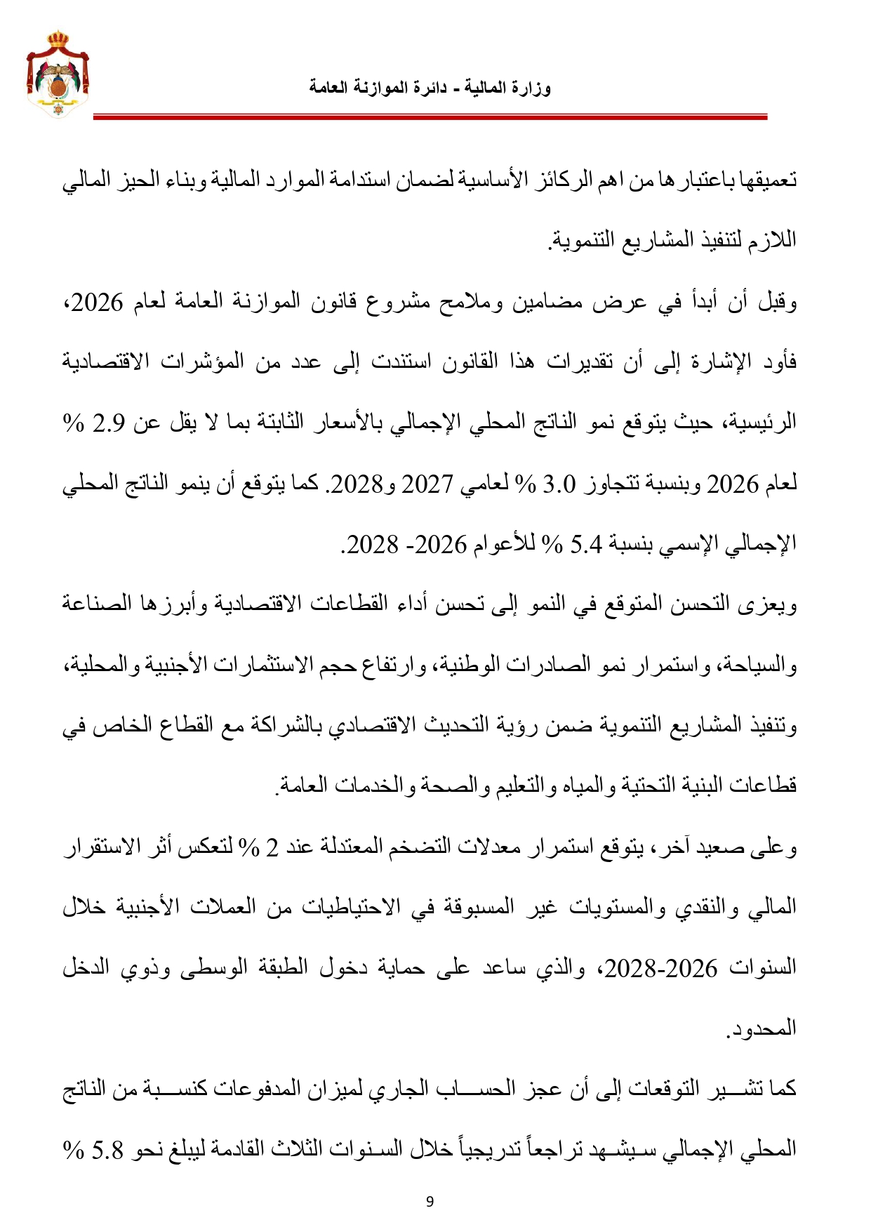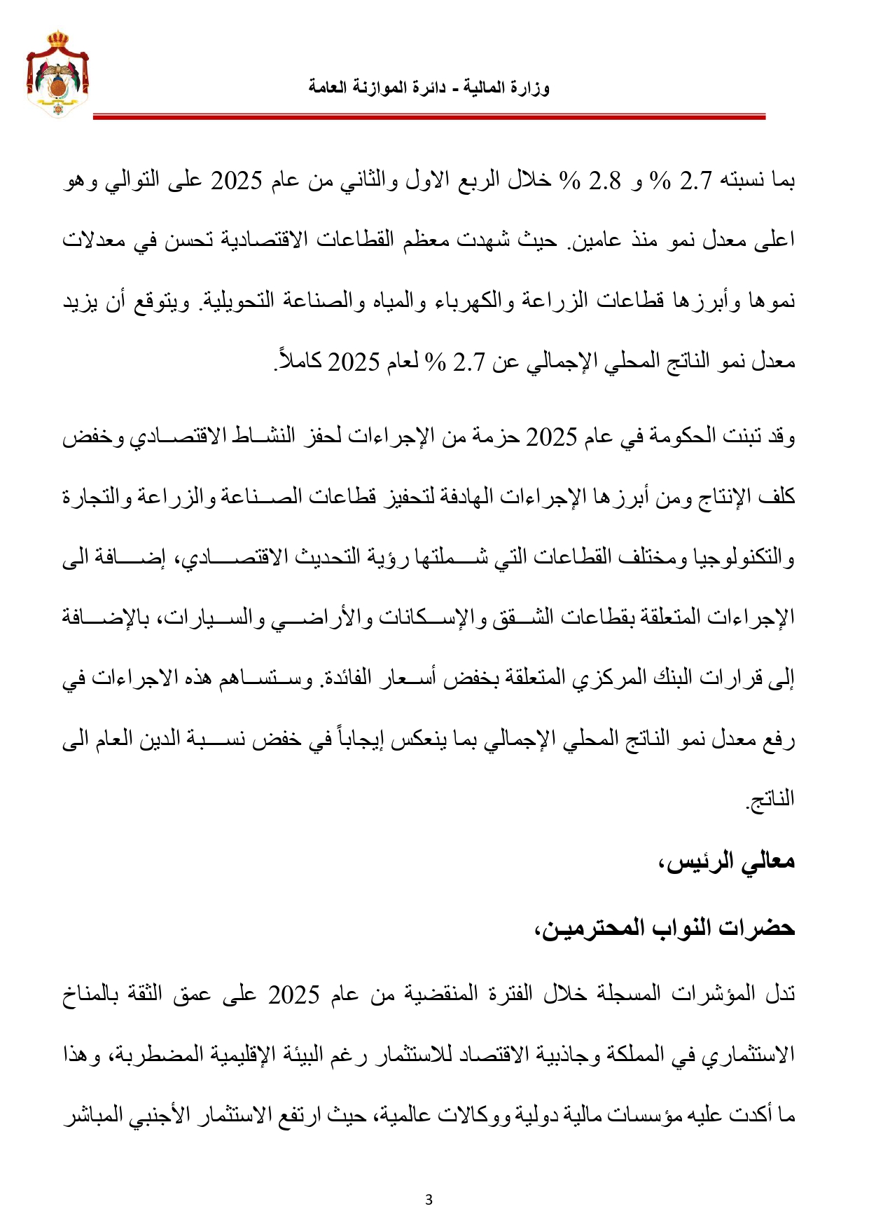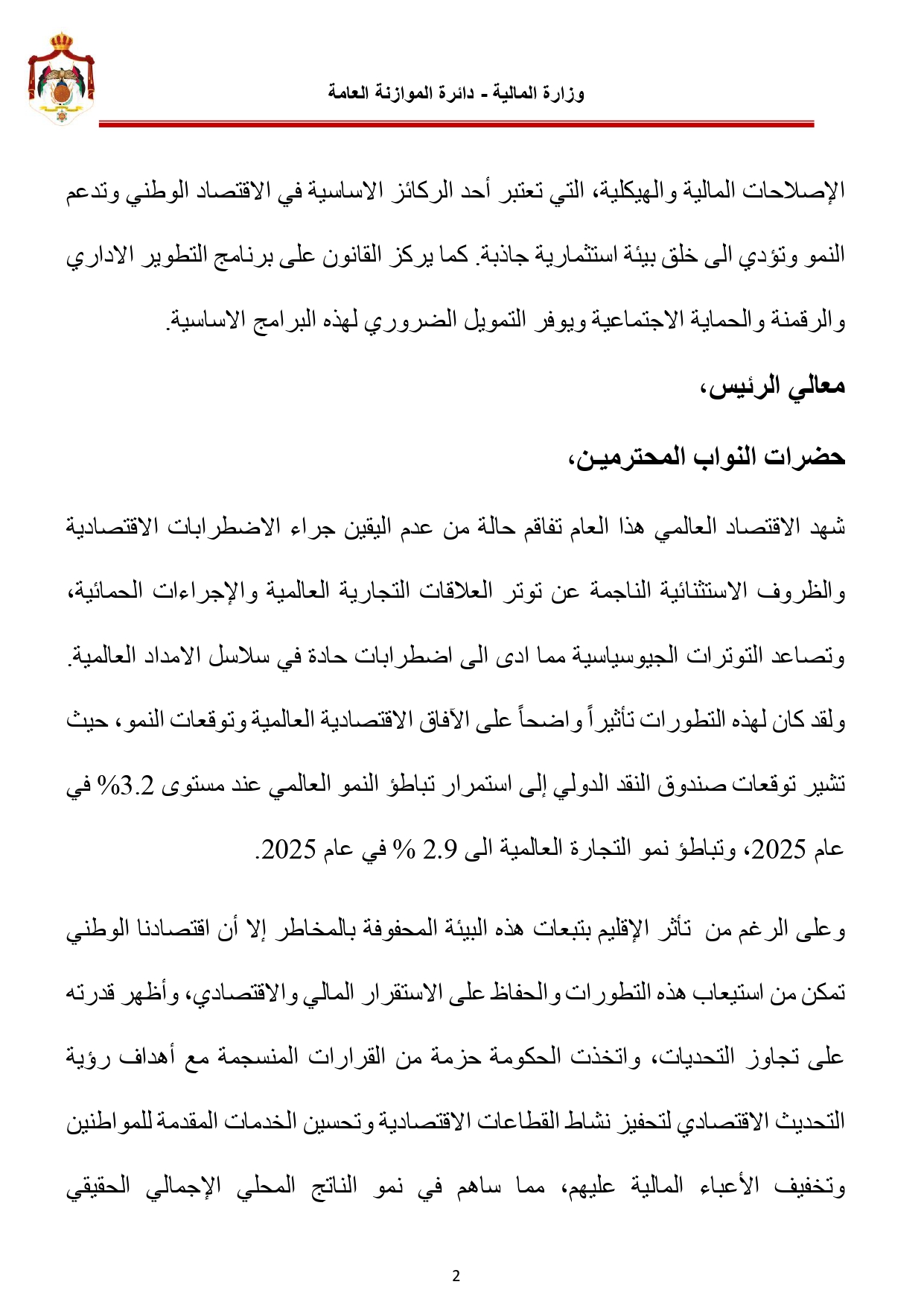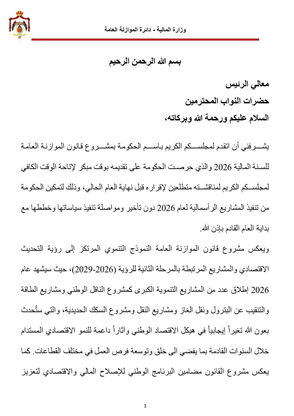 سرايا تنشر نص خطاب الموازنة: نمو بالأسعار الثابتة بما لا يقل عن 2.9 % لعام 2026