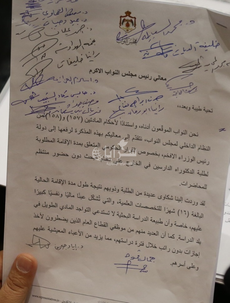 سرايا - محمد النواطير- تقدم عدد من النواب، اليوم الثلاثاء، بمذكرة نيابية، والتي تبناها النائب ابراهيم الصرايرة، للمطالبة بمراجعة القرار الحكومي المتعلق بمدة الإقامة المطلوبة من طلبة الدكتوراه الدارسين في الخارج.