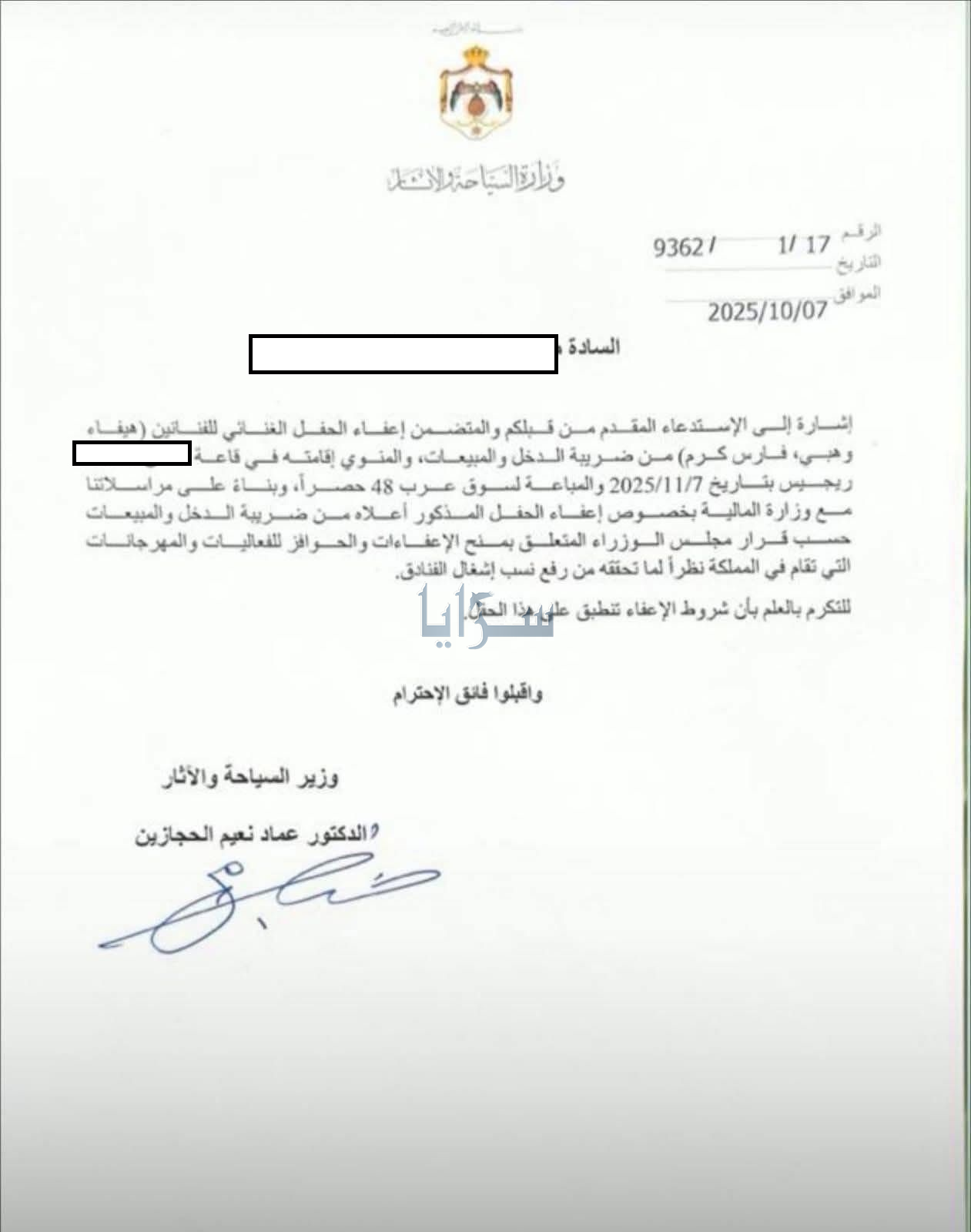 سرايا - قرر وزير السياحة والآثار إعفاء الحفل الغنائي الذي يحييه الفنانان هيفاء وهبي وفارس كرم من ضريبة الدخل والمبيعات، والمقرر إقامته في قاعة فندق سانت ريجيس بعمان بتاريخ 7 تشرين الثاني 2025.