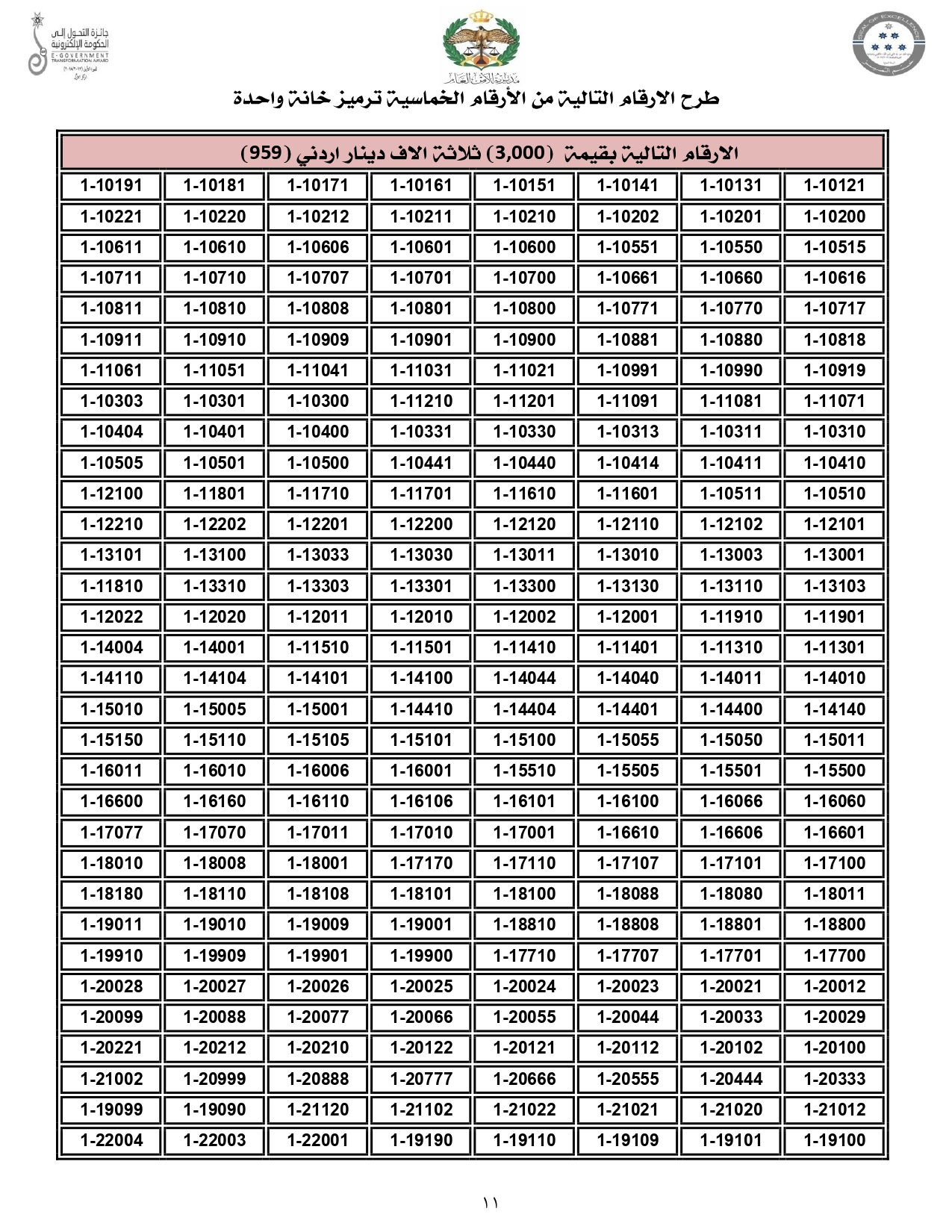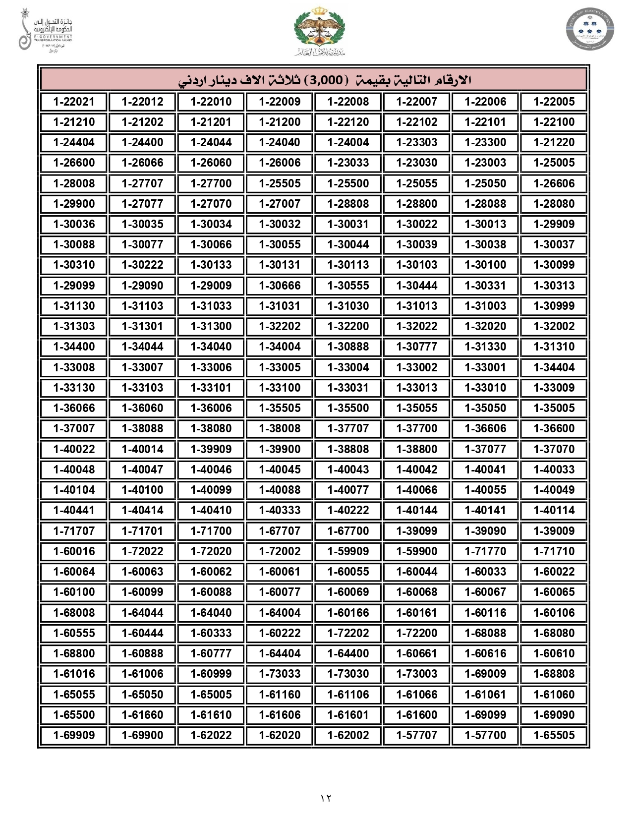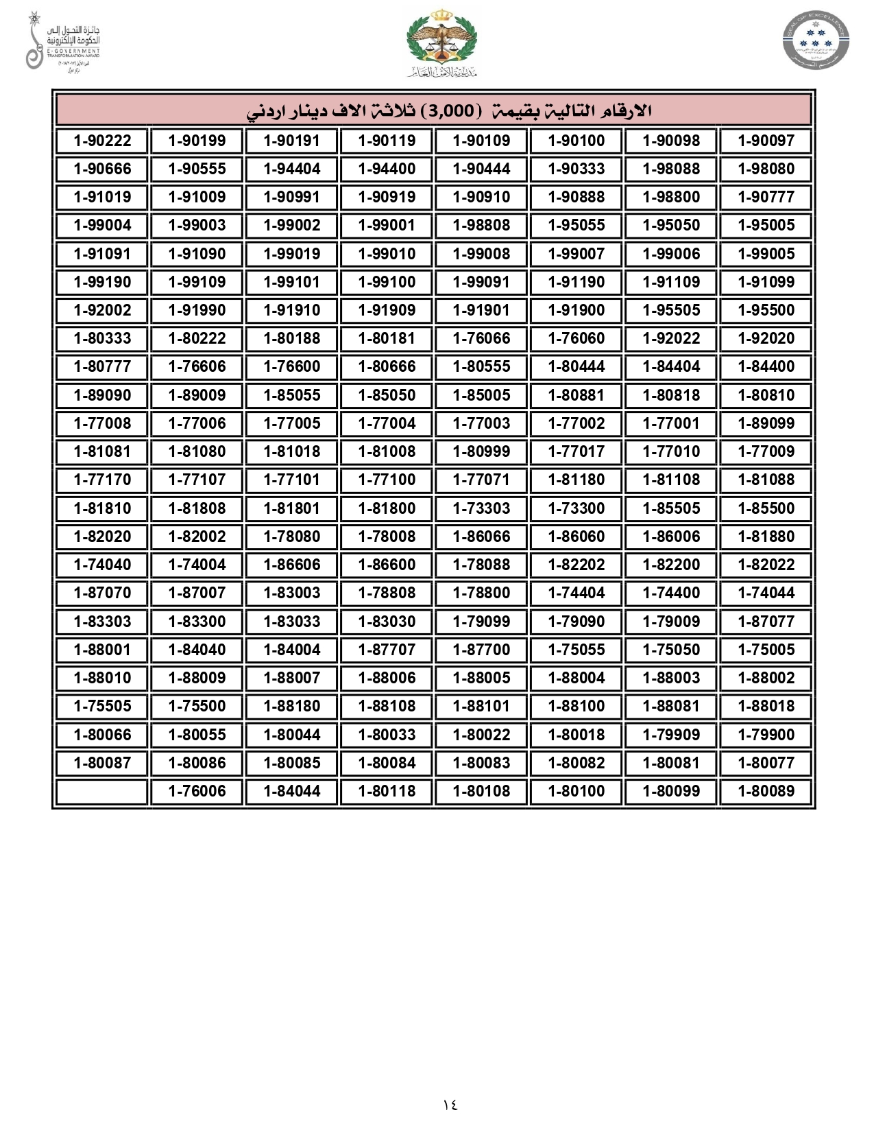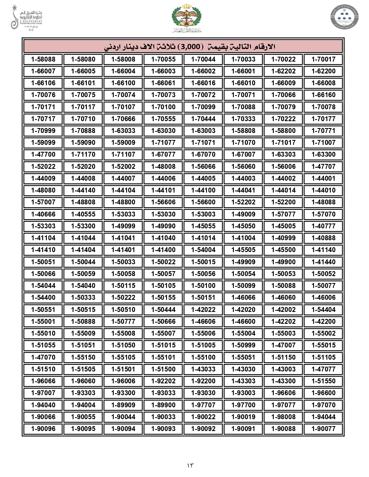 فيما يتعلق بقائمة الأرقام المتناسقة من ترميز (1) والتي تشمل نحو 4000 رقم مميز، فيمكن تحميلها من الرابط: https://dvld.gov.jo/AR/ListDetails/%d8%a5%d8%b9%d9%84%d8%a7%d9%86%d8%a7%d8%aa/1286/10.