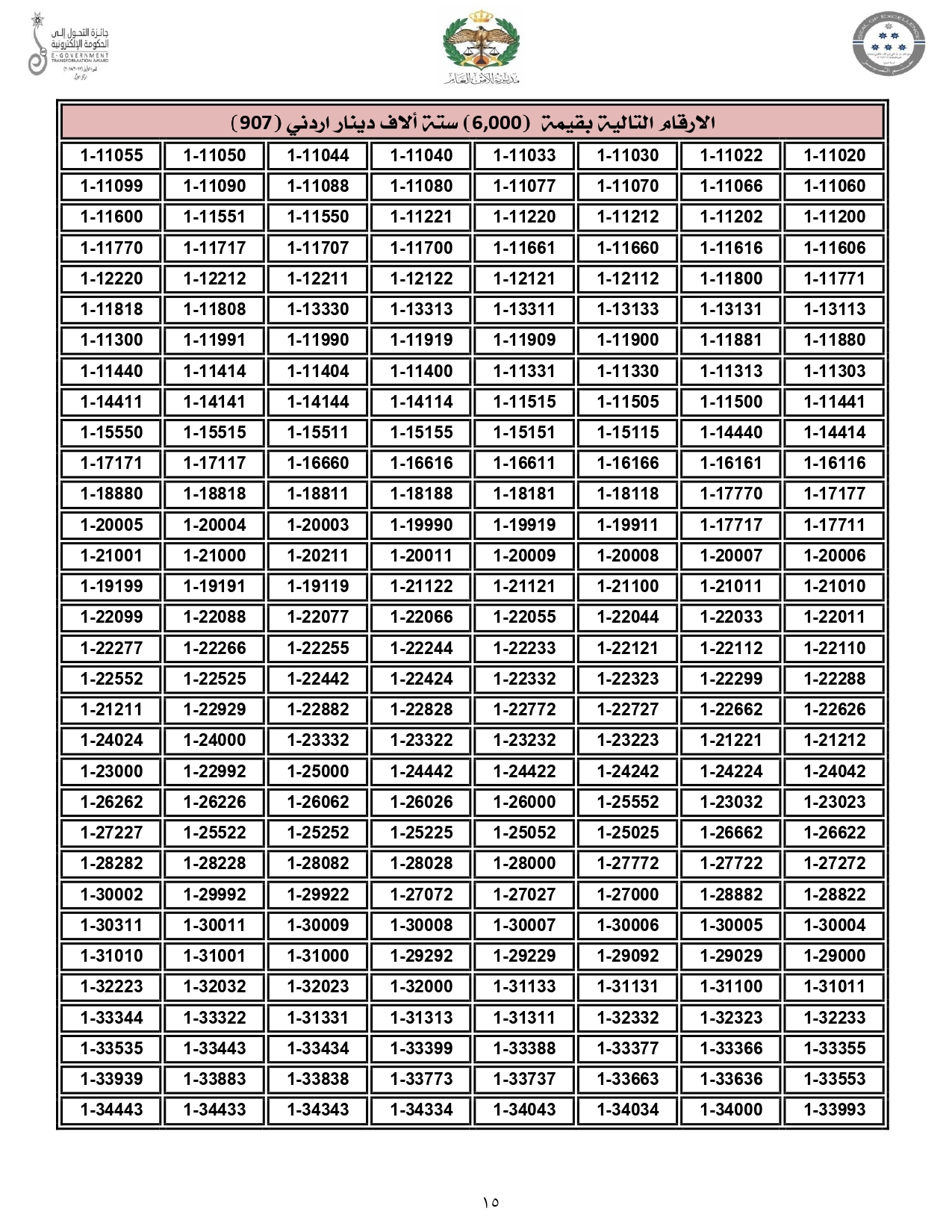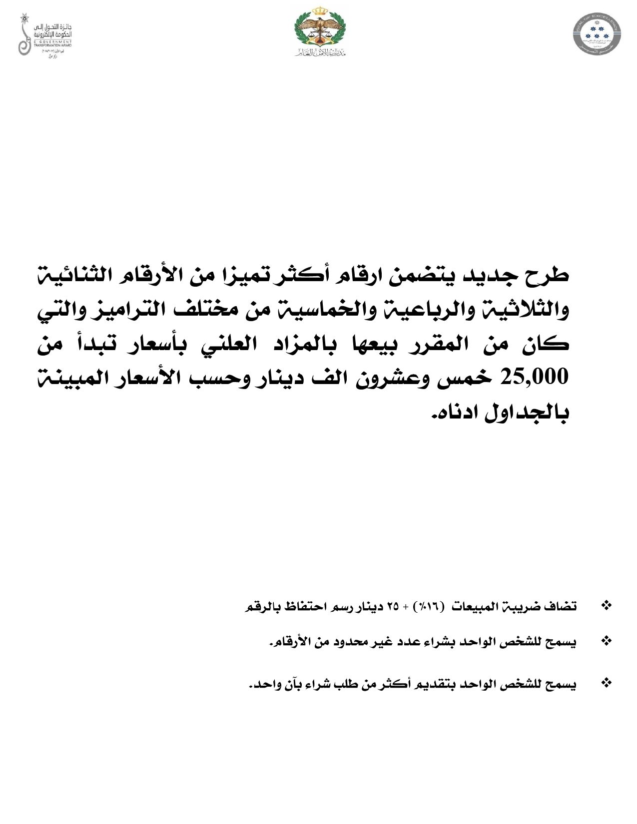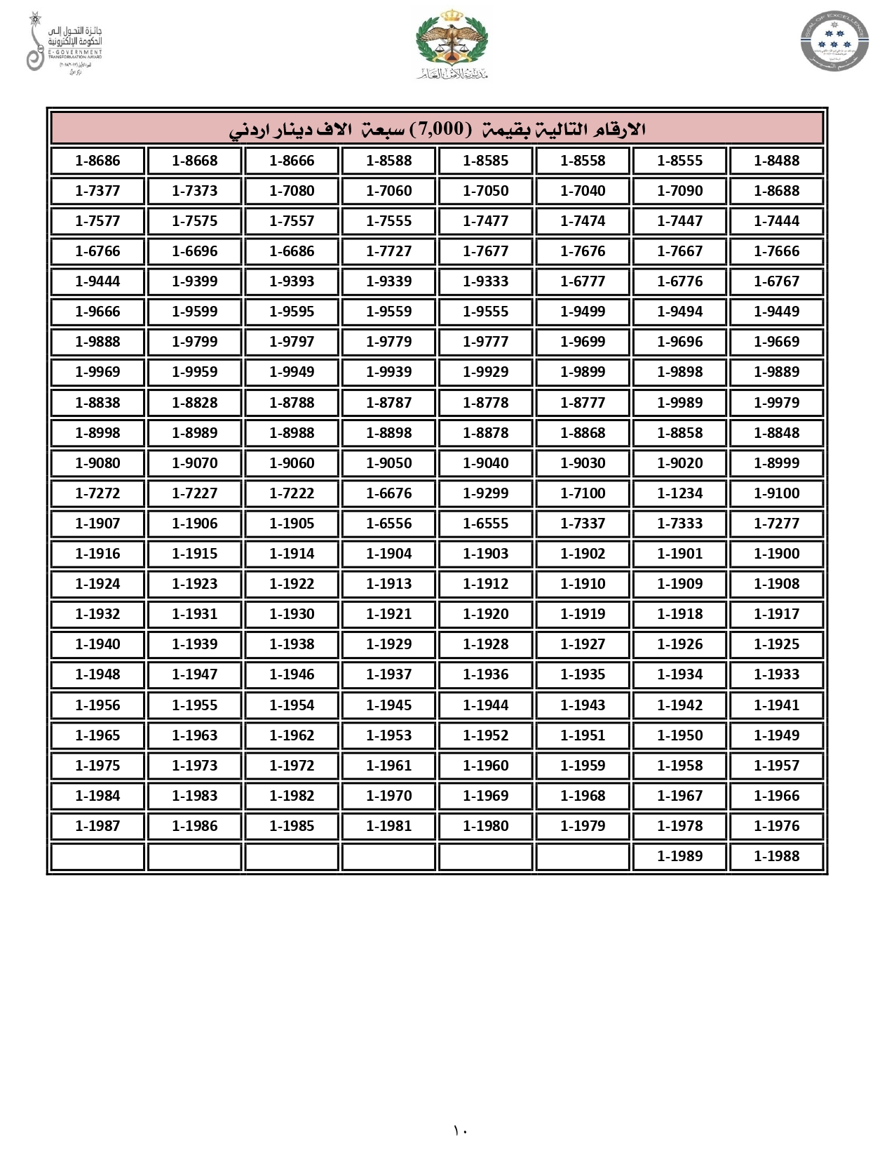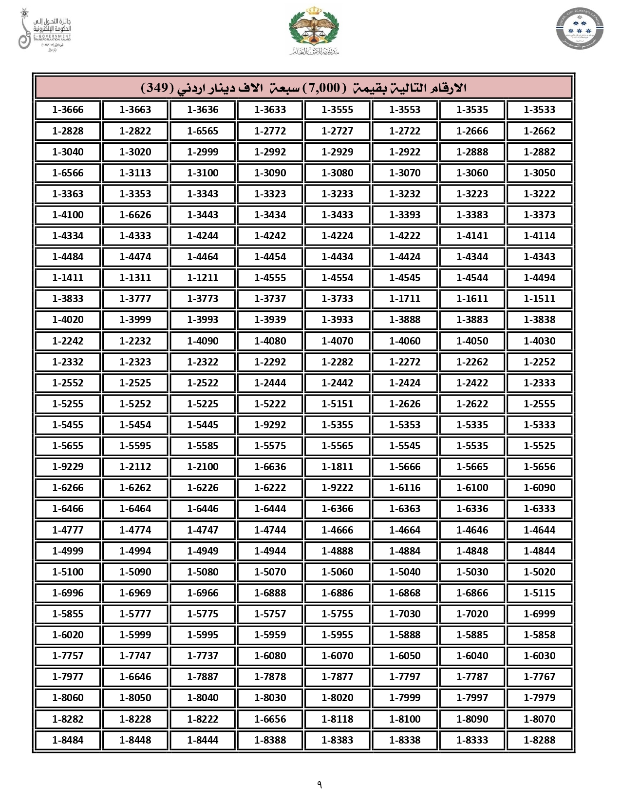 فيما يتعلق بقائمة الأرقام المتناسقة من ترميز (1) والتي تشمل نحو 4000 رقم مميز، فيمكن تحميلها من الرابط: https://dvld.gov.jo/AR/ListDetails/%d8%a5%d8%b9%d9%84%d8%a7%d9%86%d8%a7%d8%aa/1286/10.