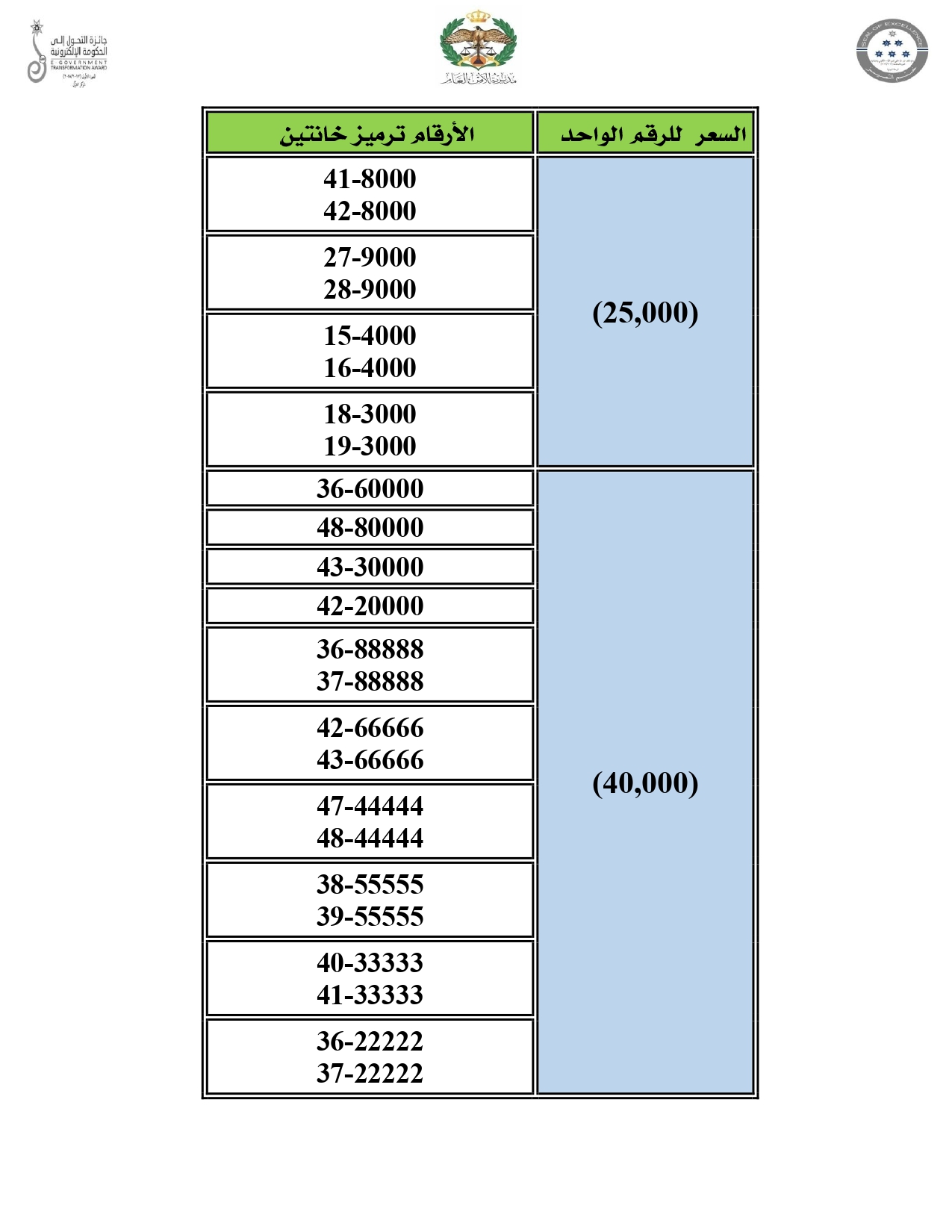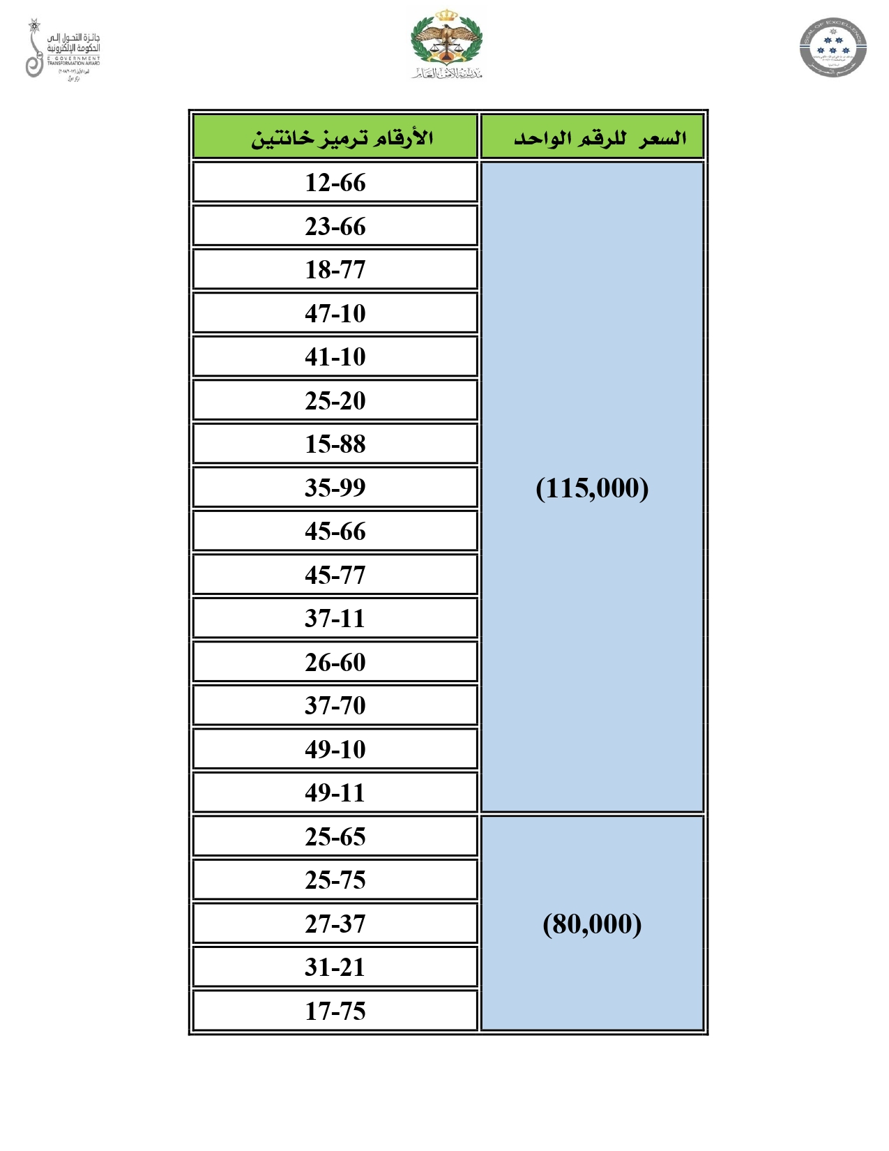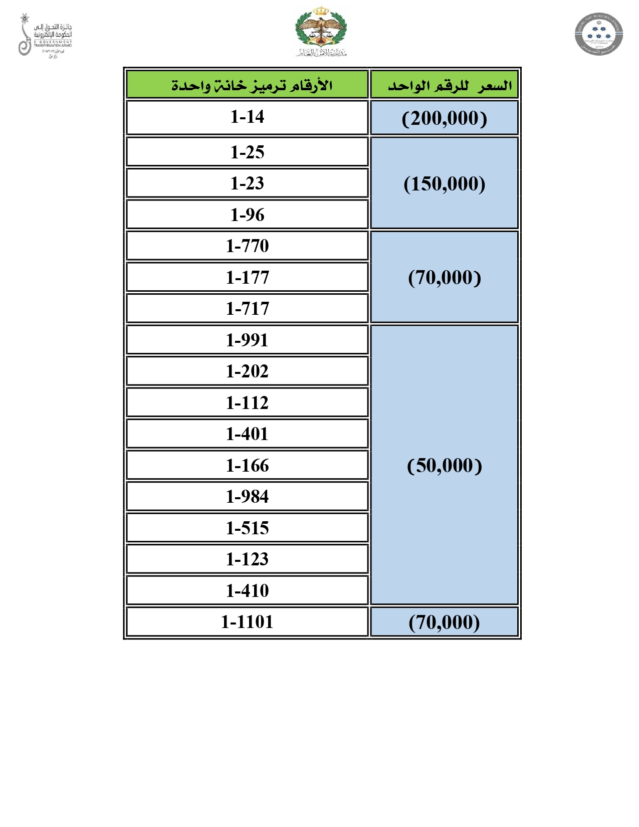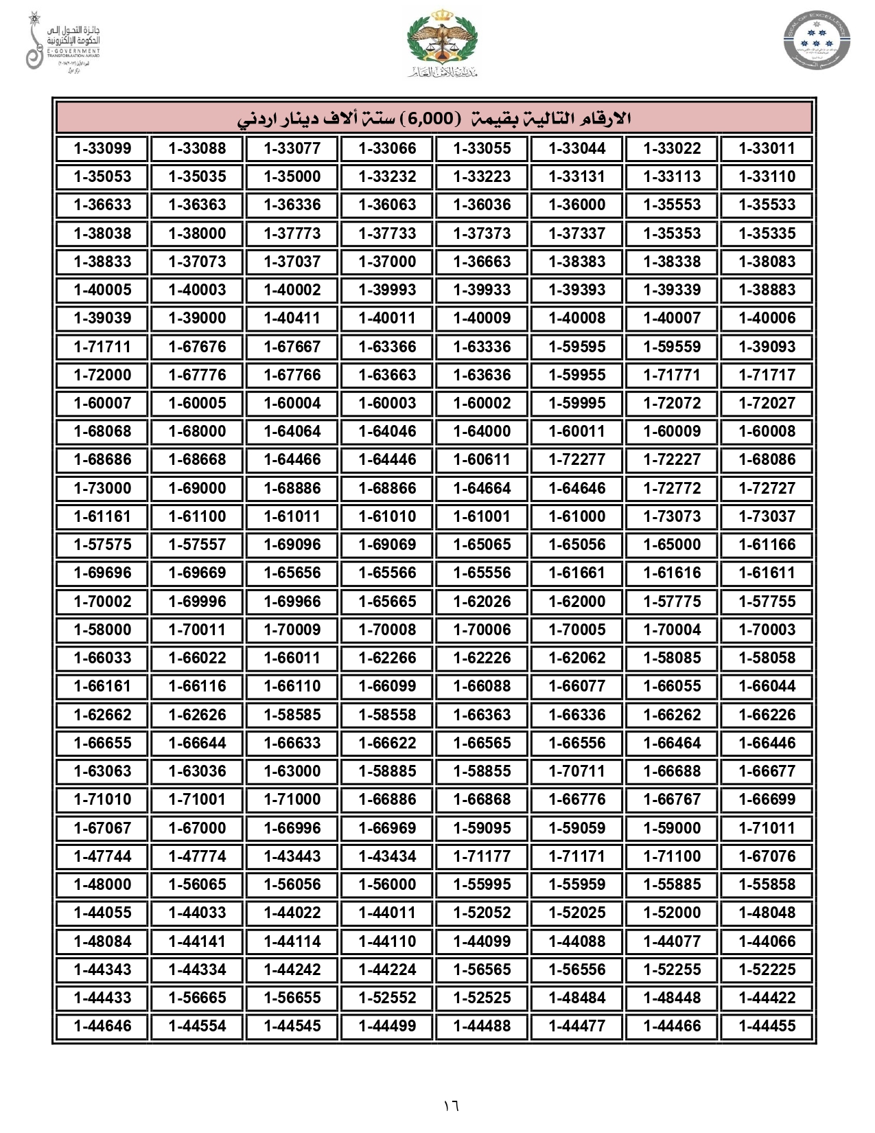 فيما يتعلق بقائمة الأرقام المتناسقة من ترميز (1) والتي تشمل نحو 4000 رقم مميز، فيمكن تحميلها من الرابط: https://dvld.gov.jo/AR/ListDetails/%d8%a5%d8%b9%d9%84%d8%a7%d9%86%d8%a7%d8%aa/1286/10.