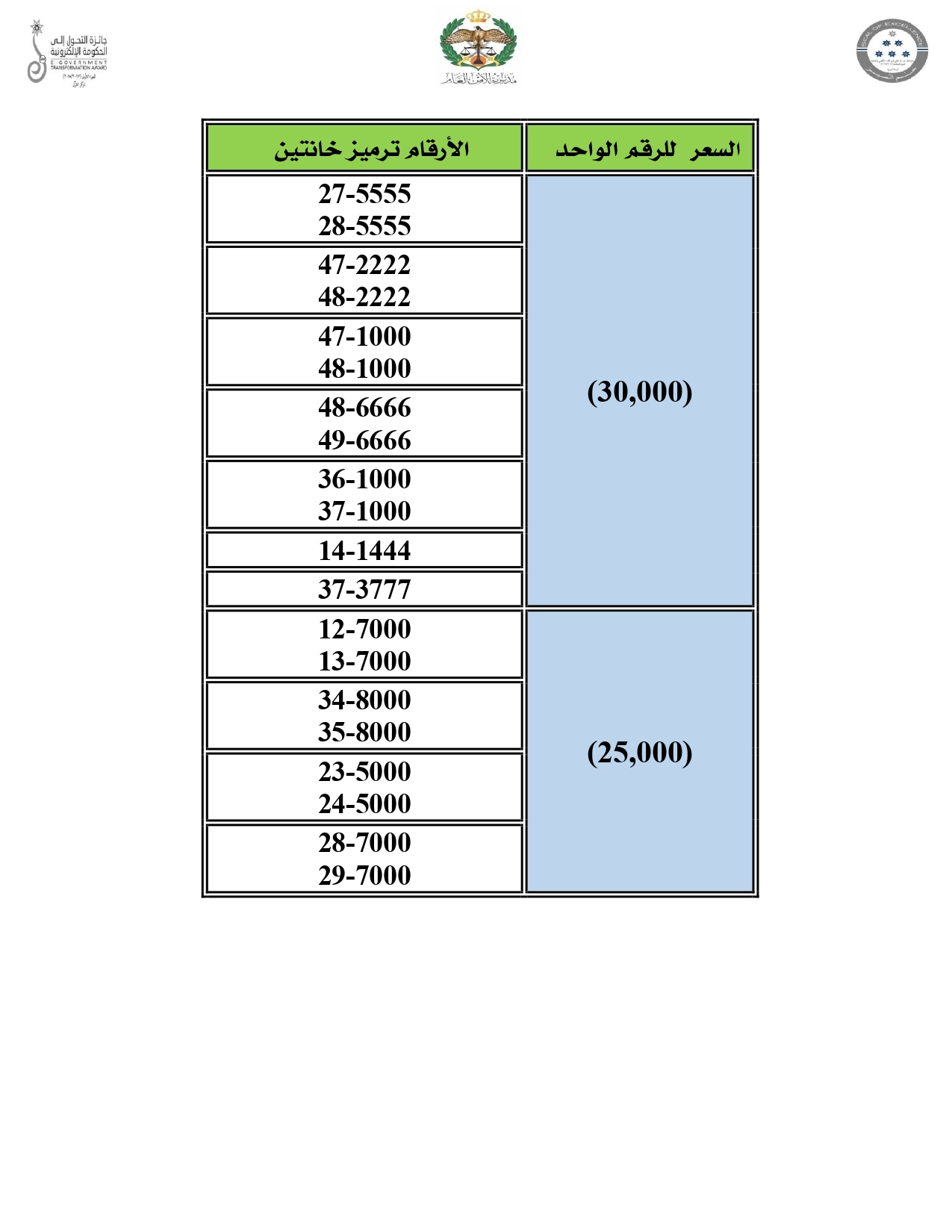 كما أعلنت الإدارة عن طرح مجموعة كبيرة من الأرقام المتناسقة من ترميز (1)، بأسعار تبدأ من 2750 دينارا.