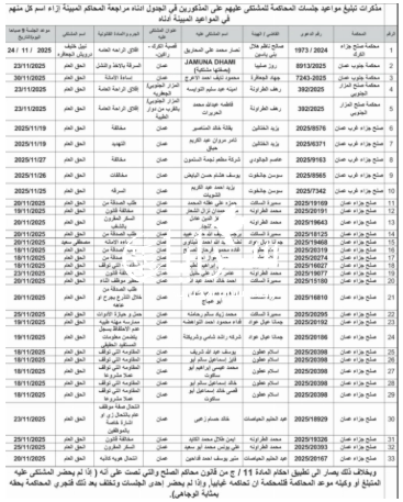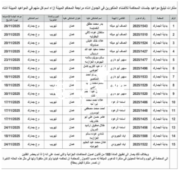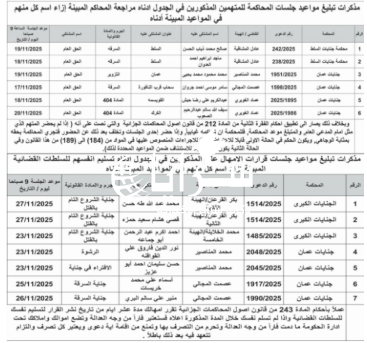 سرايا - صدرت الاثنين 17/11/2025 مذكرات تبليغ مواعيد جلسات المحاكمة لمشتكى عليهم ولمتهمين ولأظناء وقرارات إمهال.
