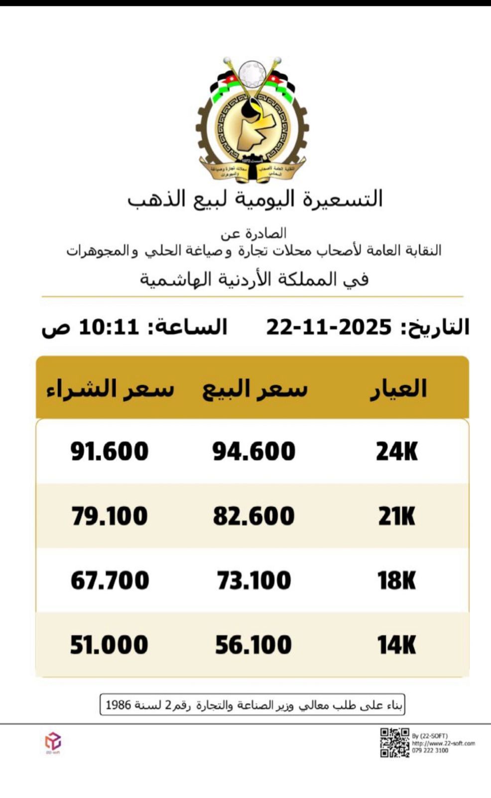 وقد بلغ سعر غرام الذهب عيار 21، الأكثر طلباً في السوق الأردني، 82.6 دينارًا للغرام الواحد.