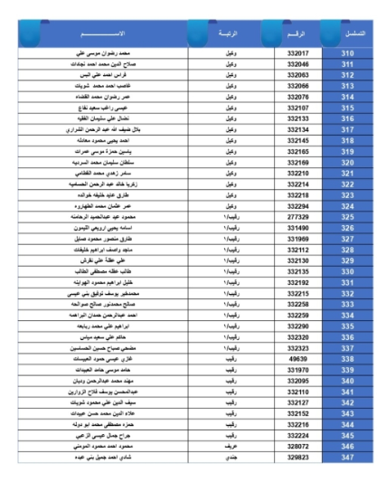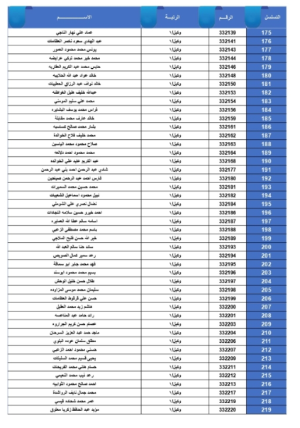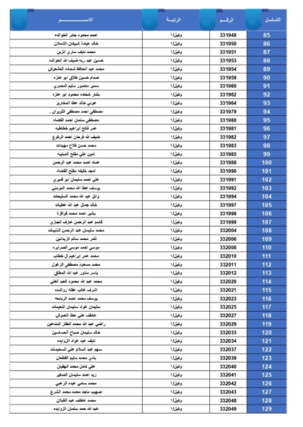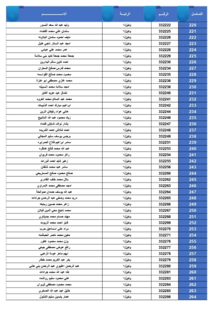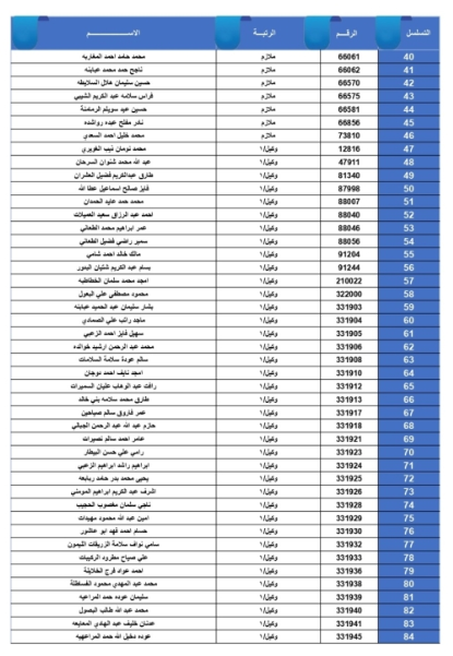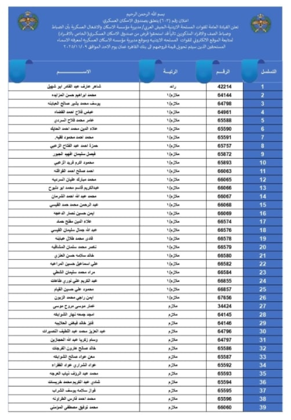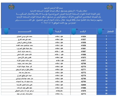 سرايا - أعلنت القيادة العامة للقوات المسلحة الأردنية الجيش العربي، من خلال مديرية مؤسسة الإسكان والأشغال العسكرية، عن استحقاق عدد من الضباط وضباط الصف والأفراد المدرجة أسماؤهم أدناه لقرض الإسكان العسكري المخصص للأفراد.