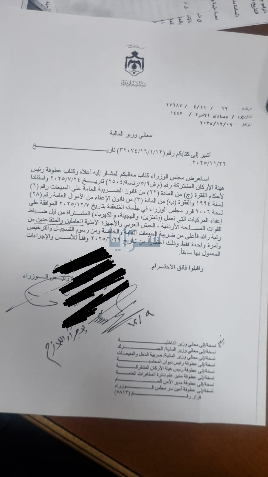 سرايا - محمد النواطير - وافق مجلس الوزراء على منح إعفاءات جديدة للمركبات المشتراة من قبل ضباط القوات المسلحة الأردنية والأجهزة الأمنية، سواء كانوا عاملين أو متقاعدين.