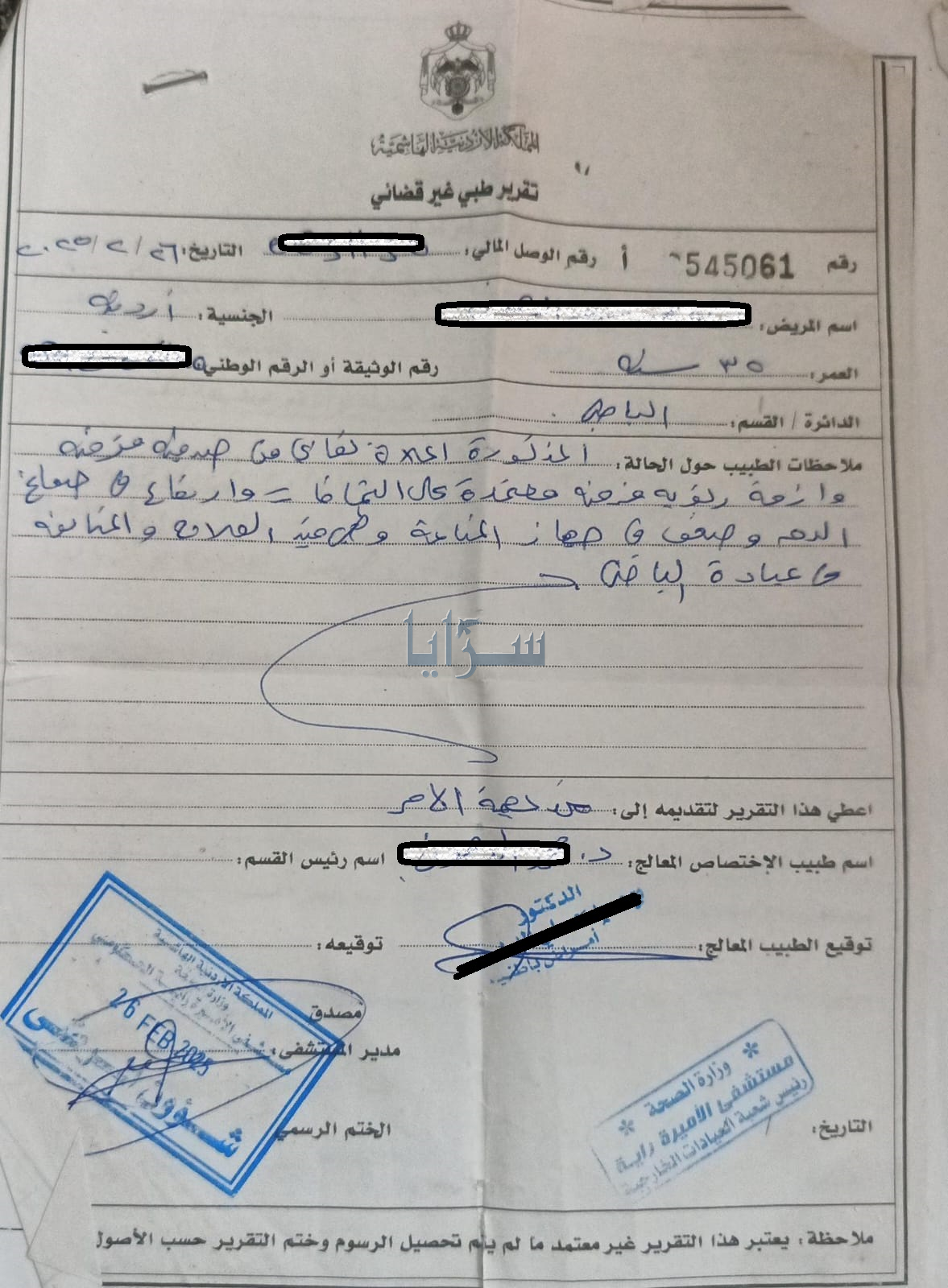 وقال رب الأسرة لسرايا إن الفحوصات الطبية أظهرت ارتفاعاً حاداً في صفائح الدم لدى زوجته، بينما عجز الطب عن تحديد طبيعة المرض بشكل قاطع، مما جعله يتوجه نحو خيار العلاج بالليزر والإشعاع الحراري كفرصة أخيرة للشفاء.