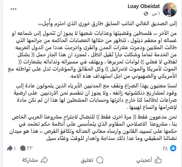سرايا -  وجّه المحامي عبيدات رسالة إلى النائب الأسبق طارق خوري، عبّر فيه عن موقفه من توظيف القضية الفلسطينية في صراعات إقليمية متشابكة، محذرًا من اختزال آلام الشعب الفلسطيني أو تحويلها إلى أداة تبرير أو غطاء أخلاقي لمشاريع وأنظمة لا تخدم الأمة ولا تحمي شعوبها، مؤكدًا أن بوصلـة النضال الحقيقي يجب أن تبقى واضحة، بعيدة عن الشعارات الزائفة والانقسامات العبثية.