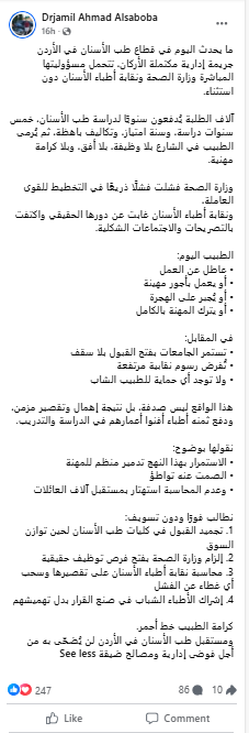 طبيب أسنان أردني ينتقد وزارة الصحة ونقابة الأطباء محذرًا من "تدمير منظم" للمهنة - تفاصيل