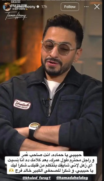 سرايا - أعاد الفنان تامر حسني، وعبر خاصية القصص المصورة الملحقة بحسابه الخاص في "إنستغرام" نشر فيديو من تصريحات حمادة هلال التي يعتذر فيها له بعد الخلاف على أغنية "عيش بشوقك" التي غنّاها تامر حسني وحققت نجاحاً كبيراً.