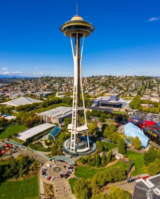 عالم الفضاء Space Needle، الذي يتمتّع بهيكل ذي تصميم فريد عبارة عن برج شهير يعلو 605 أقدام، في مدينة سياتل ويقع على قمّة تلّ. كان افتتح في 21 أبريل 1962 لمعرض Century 21 العالمي عن عصر الفضاء. في المكان، سطح مراقبة داخلي ومنطقة عرض في الهواء الطلق تقع على ارتفاع 520 قدمًا، ومستوى مراقبة يتميز بأرضية زجاجية دوارة على ارتفاع 500 قدم فوق الأرض. لا تستقيم الزيارة من دون التوقف في في مطعم SkyCity الدوار.
